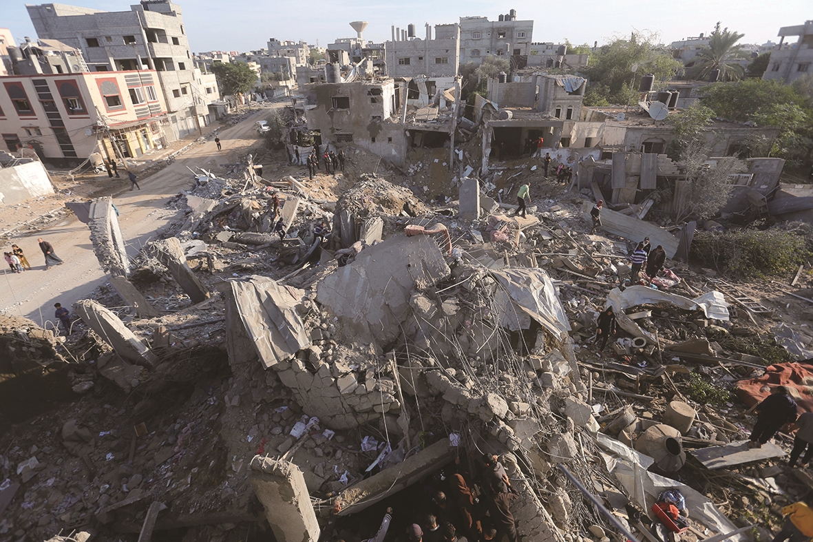 12月4日,加沙南部城市拉法,人们查看以军空袭后的住宅废墟。
