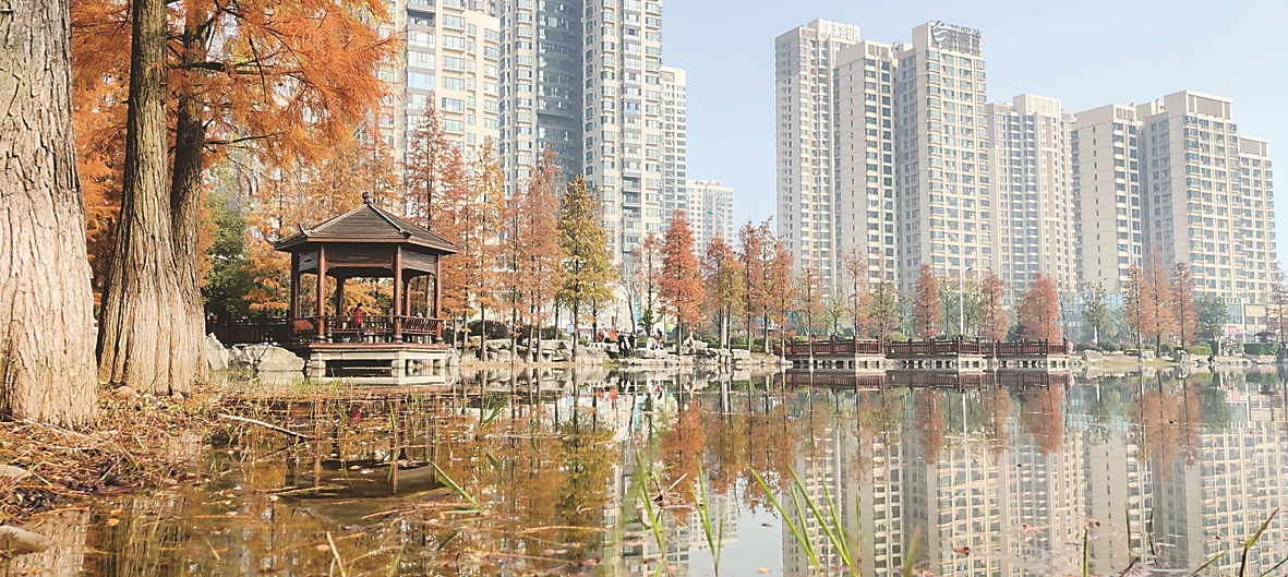 12月6日,暖阳。天元区栗雨湖休闲谷,褐红色的水杉与林立的高楼交相映衬,宛如一幅油彩画。 株洲晚报融媒体记者/马文章 摄