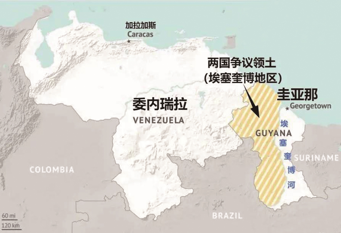 处于争议焦点的是埃塞奎博河周边16万平方公里土地的归属问题。现为圭亚那实际管辖的埃塞奎博地区位于圭亚那中部埃塞奎博河以西,与委内瑞拉领土相连,面积约15.9万平方公里,占圭亚那领土面积三分之二。两国对埃塞奎博地区归属问题的争议由来已久,路透社称,圭亚那近年来在该地区海上边界附近发现石油和天然气后,两国的争端再度升级。