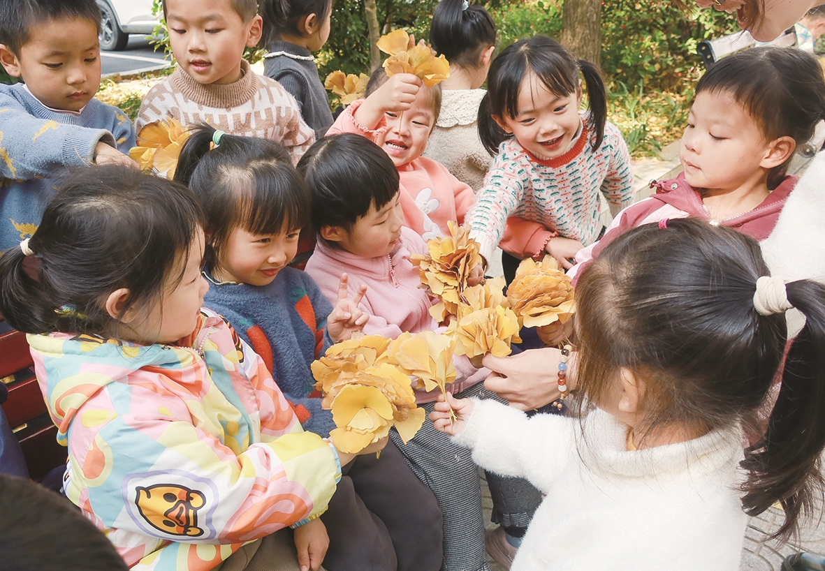 12月7日,农历大雪时节,我市城区冬日暖阳,温暖如煦。在天元区黄河北路,邮电源幼儿园中班的孩子们,在老师的带领下观赏银杏落叶。 株洲晚报融媒体记者/刘震 摄