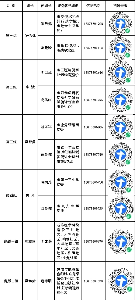 巡察期间,各巡察组设专门值班电话、征求意见箱等,受理反映被巡察党组织领导班子及其成员、市委(县市区委)管理的其他干部及下一级主要负责人、重要岗位主要负责人等问题的来信来电来访,重点是关于违反政治纪律、组织纪律、廉洁纪律、群众纪律、工作纪律和生活纪律等方面的举报和反映。其他不属于巡察受理范围的信访问题,将按规定转交有关部门处理。现将各巡察组的值班电话(接听时间为:上午8:00-12:00,下午14:30-17:30),以及扫码举报“二维码”予以公布。