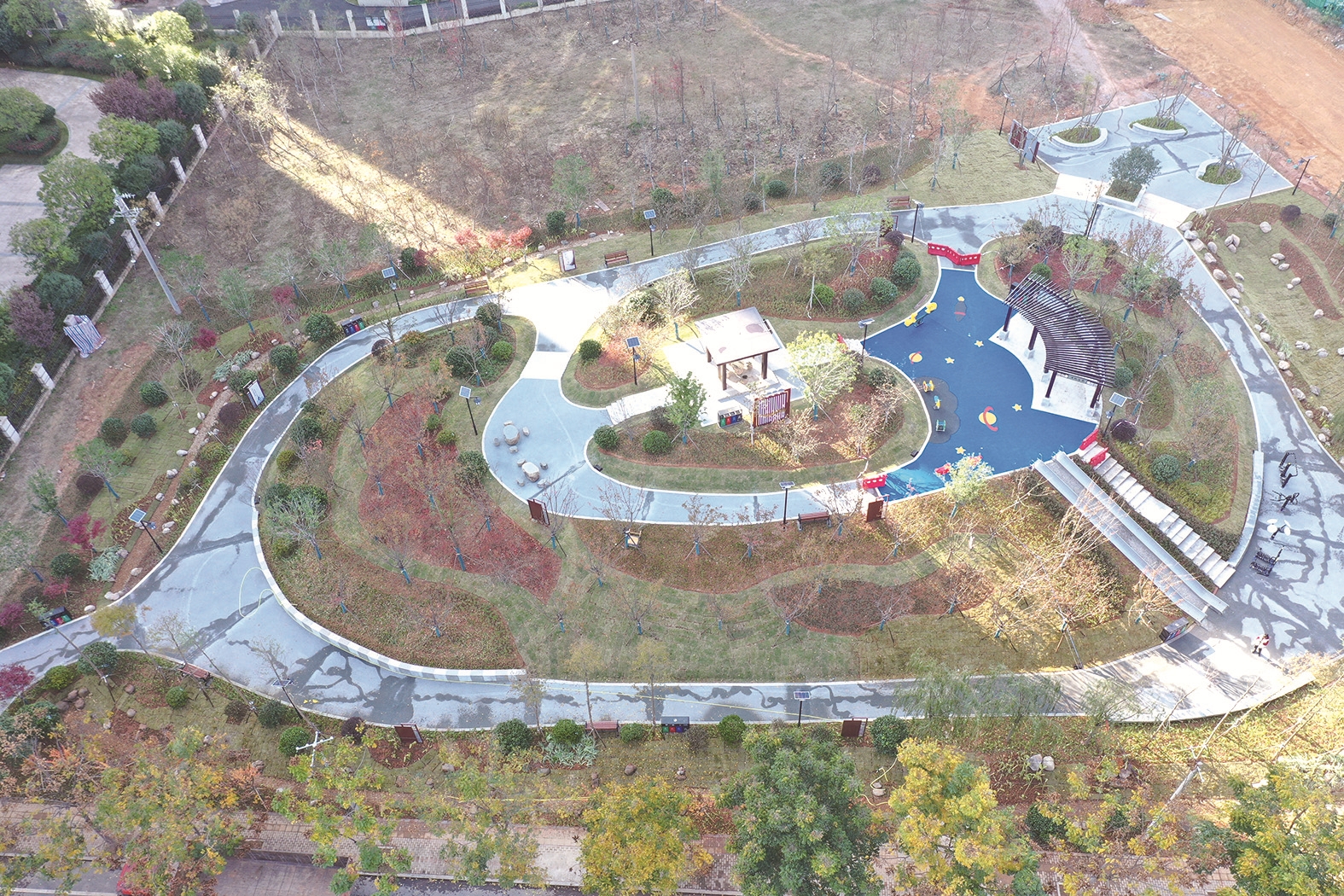 走进黄山西路附近的凿石微公园,游廊步道与绿树相互衬映,休闲座椅、健身器材一应俱全。这个微公园建设面积约4000平方米,于9月正式动工,作为全市首批海绵化改造的微公园,园内还通过引入透水混凝土游路、植草沟等方式,合理实现雨水的收集利用。