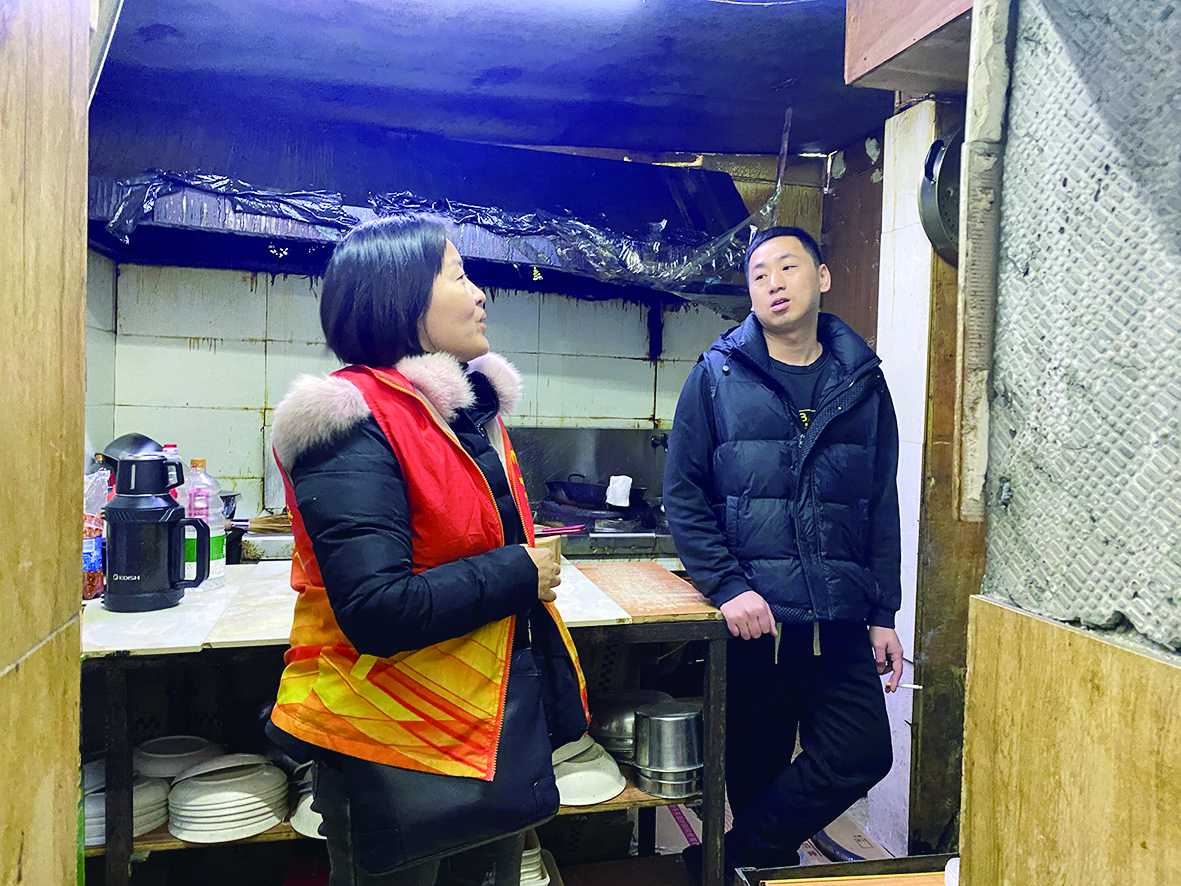夏琳(左一)走进老旧小区居民身边现场解决下水道堵塞情况 记者/杨凌凌摄