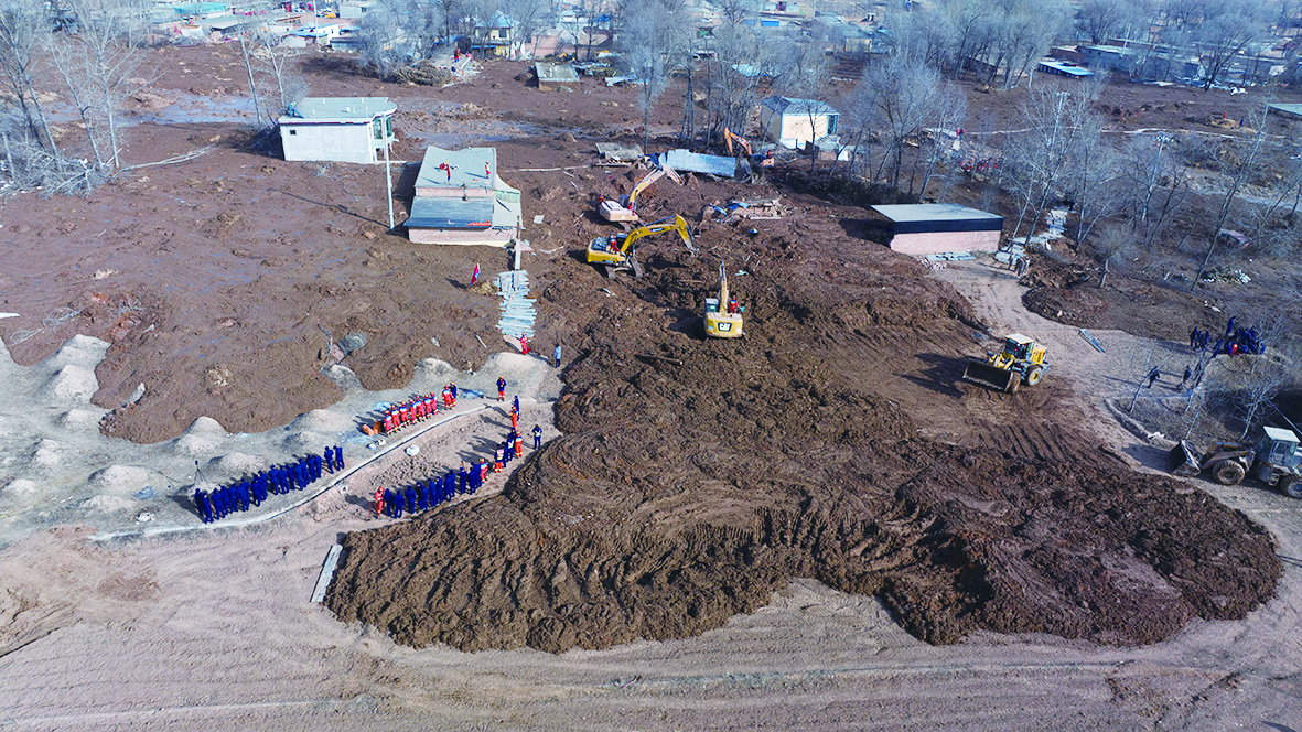 12月19日,救援机械和人员在青海民和县中川乡金田村清理地震引发的砂涌。