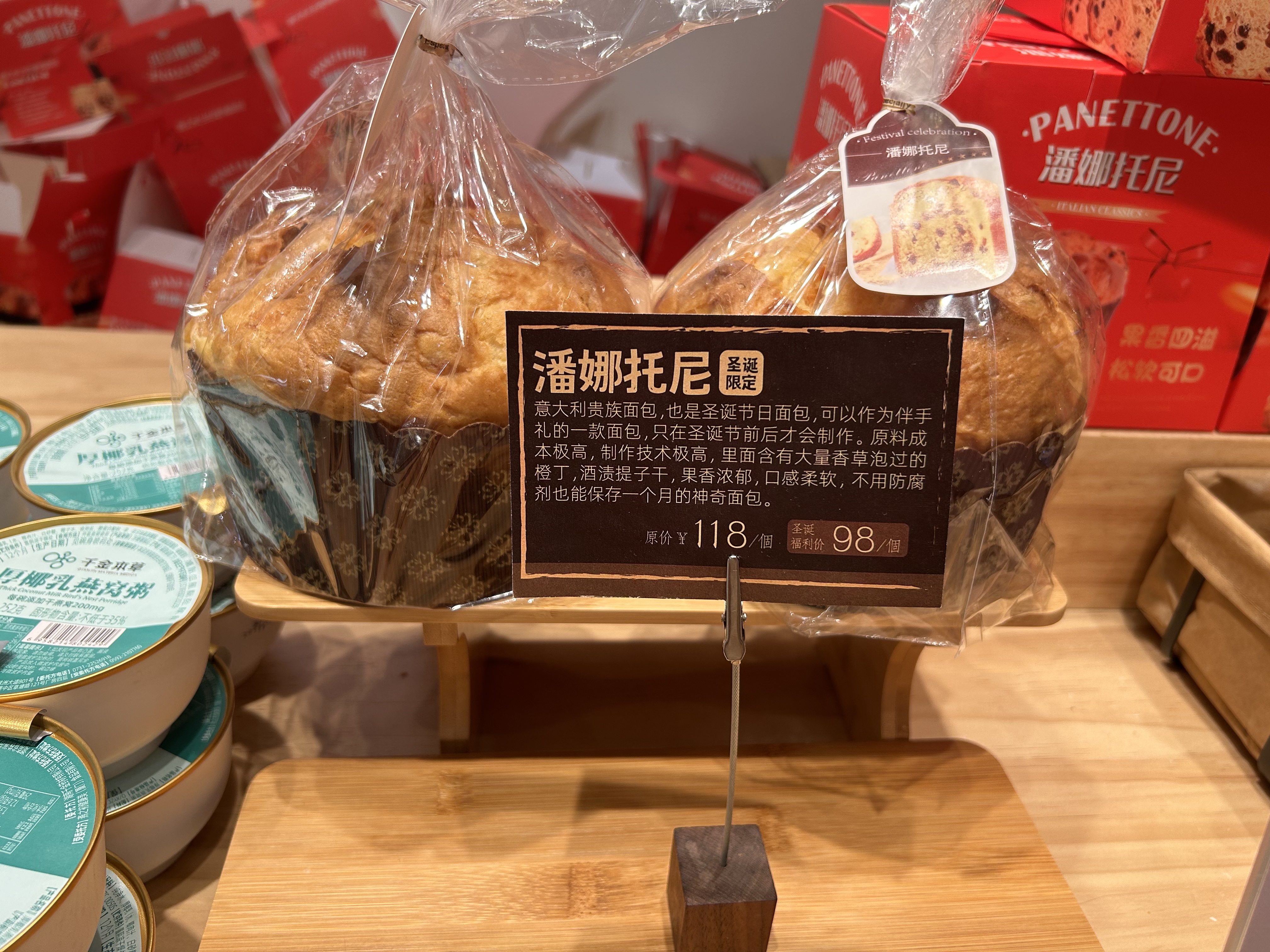 在入口显眼处,一款潘娜托尼面包被摆在高脚托盘上,简介牌上介绍,“这是一款意大利贵族面包,也是圣诞节日面包。”而这款面包的价格更是让不少顾客“破防”——原价118元,圣诞节福利价98元,不少市民表示“高攀不起”。