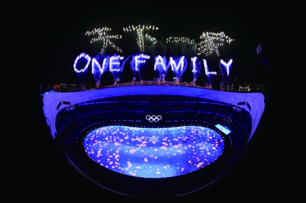 2022北京冬奥会闭幕式,现场烟花表演,“天下一家”、“ONE FAMILY”字样点亮鸟巢上空。