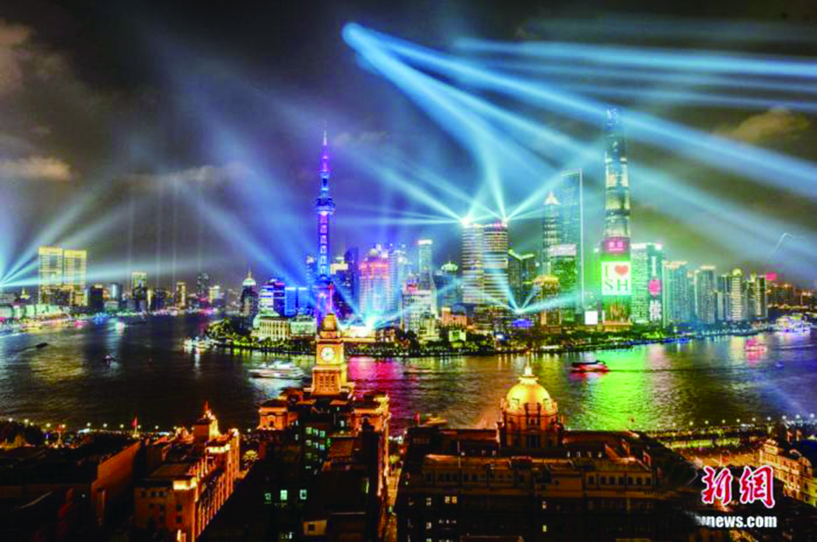 上海外滩国庆灯光秀流光溢彩。