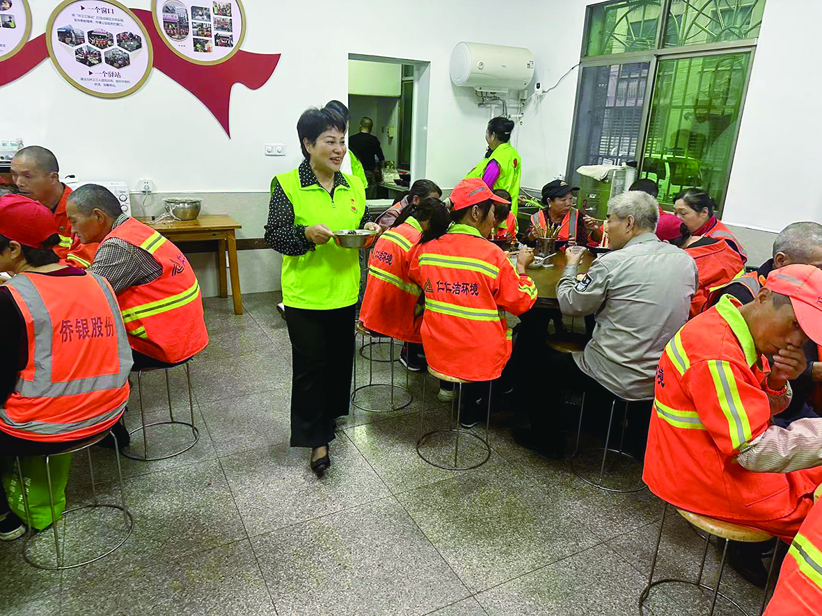 张满珍(中)在驿站内为环卫工人端上早餐。 受访者供图