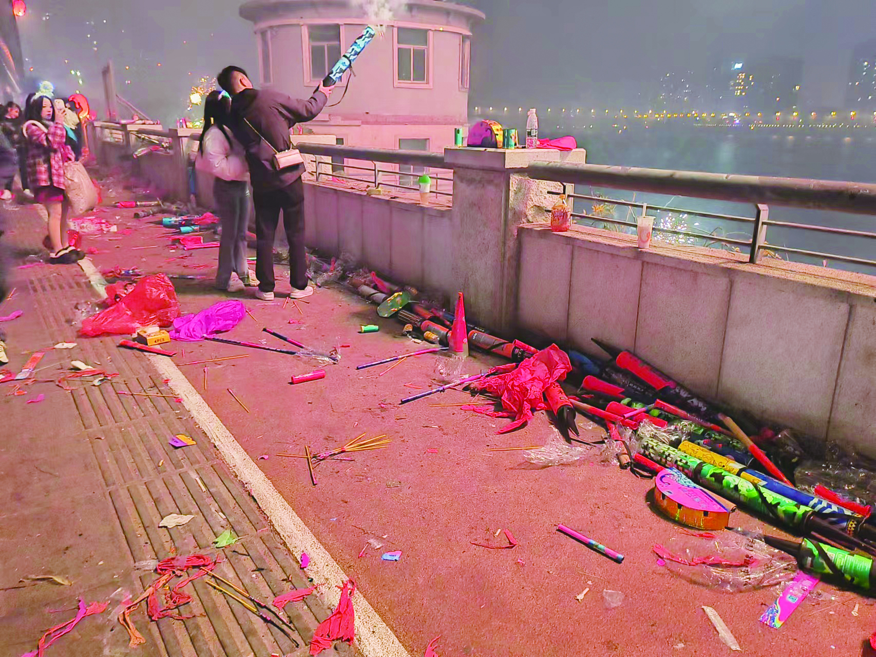 2023年12月31日晚,不少市民来到市中心跨年,在江边燃放烟花,放飞孔明灯,祝愿来年平安顺意。记者看到,有部分市民燃放烟花后,纸壳随意丢弃在观景台、江边以及马路上。除了燃放烟花,跨年夜美食也必不可少,记者看到,大多数市民在品尝美食后,自觉将垃圾扔到垃圾箱,也有少数市民游客随地扔垃圾,破坏温馨的节日氛围。