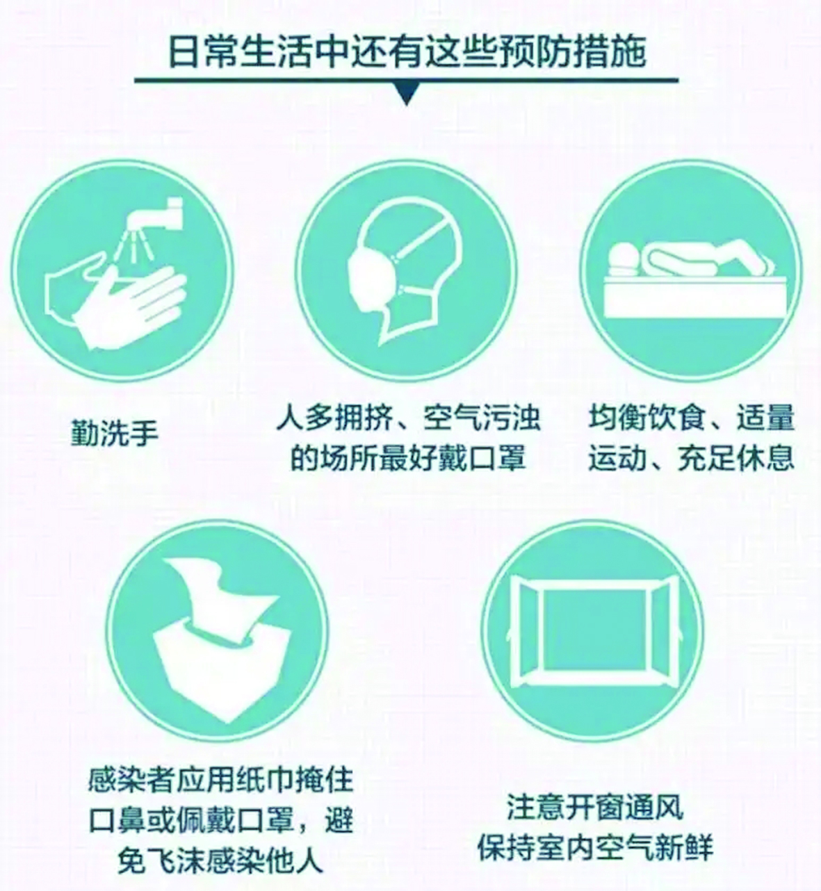 日常生活中还有这些预防措施 勤洗手 人多拥挤、空气污浊的场所 最好戴口罩。 均衡饮食 适量运动 充足休息 感染者应用纸巾掩住口鼻佩戴口罩, 避免飞沫感染他人。 注意开窗通风 保持室内空气新鲜