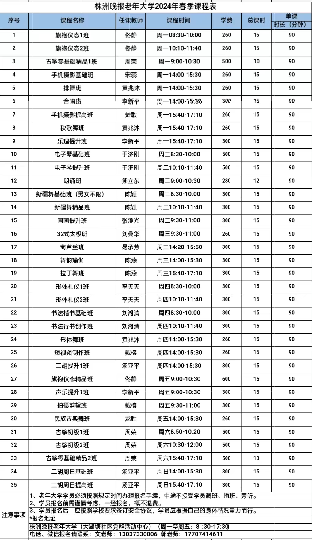 本报讯(株洲晚报融媒体记者/文美英) 株洲晚报老年大学成立于2019年,隶属株洲日报社。2024年春季班计划开设35个班,拟开设声乐、旗袍、新疆舞、民族舞、太极、二胡、书法、国画、古筝、手机摄影等课程,计划招生800人。后续依据实际情况进行调整。
