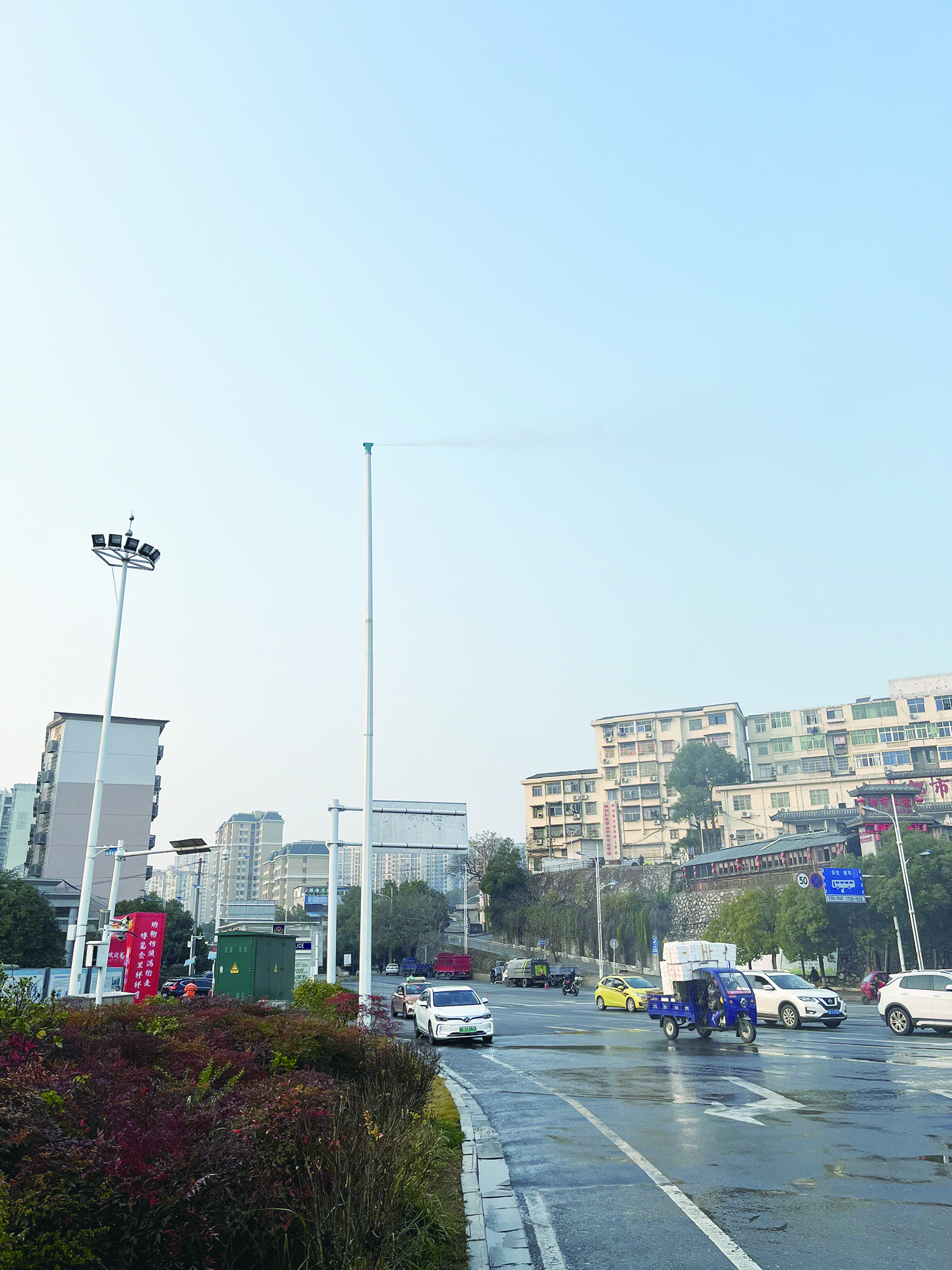 经核实,这是一套道路喷雾除霾设备,由主机系统控制,可完成无人值守自动化喷雾作业。有关该设备的相关资料宣称有“除霾除尘净化空气作用,还能起到喷雾降温和城市美化的作用”。