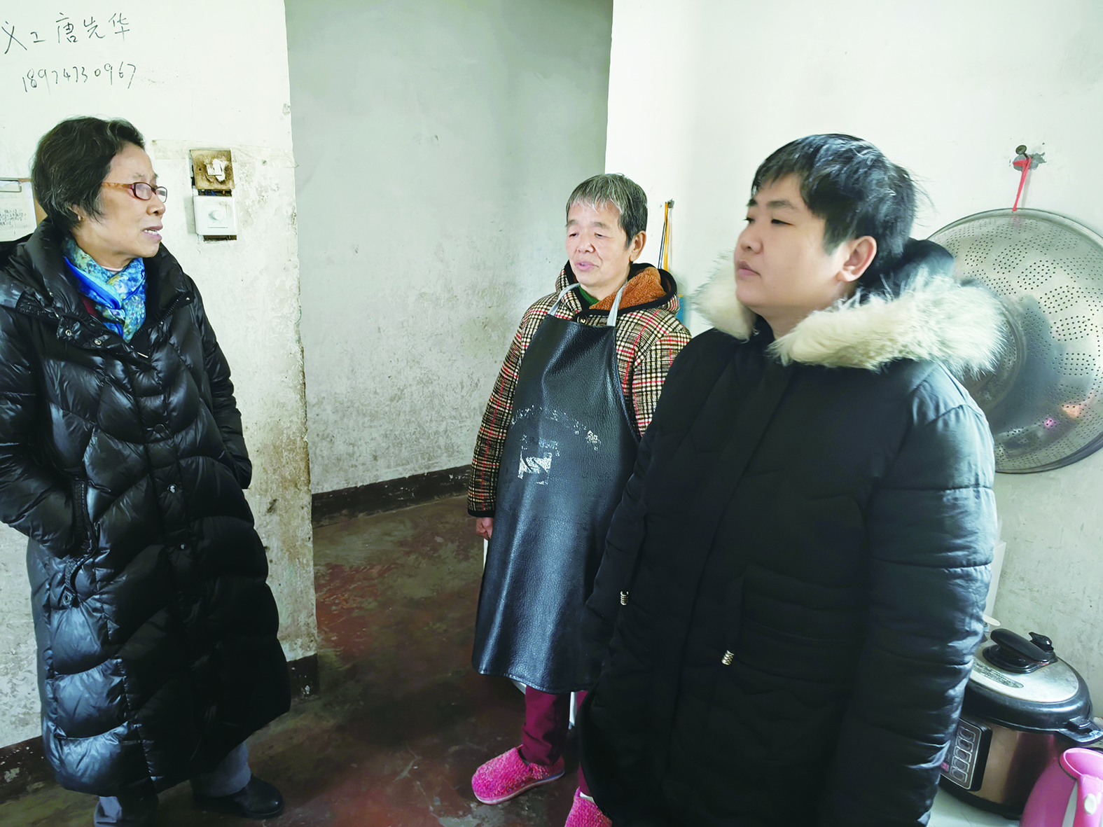 晚报志愿者欧阳利华(左一)与袁艳(右一)交流。记者/杨凌凌 摄