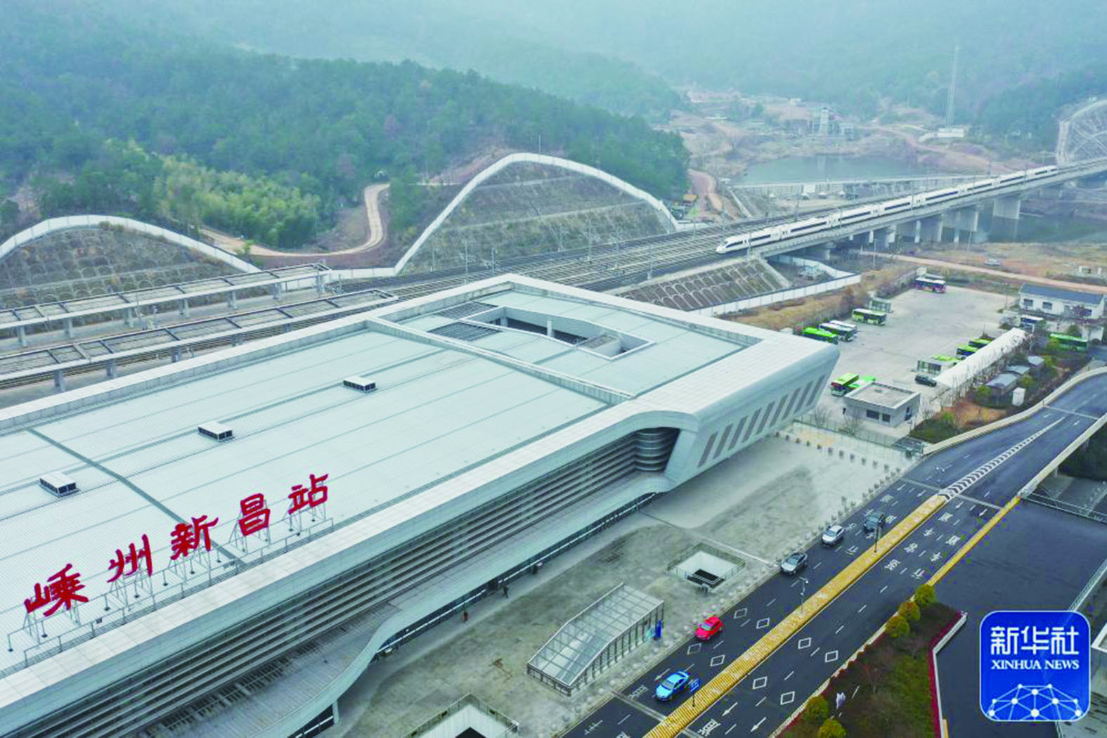 1月8日,一趟列车驶入绍兴嵊州新昌站(无人机照片)。