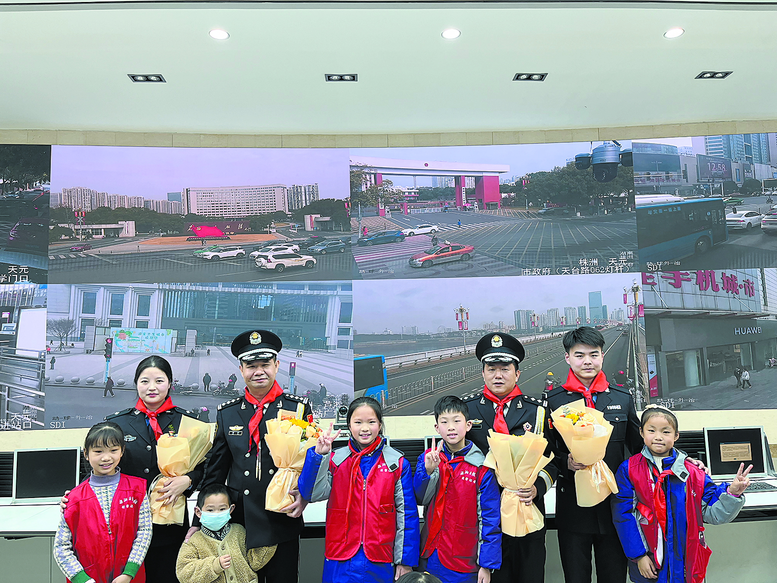 “警察叔叔,节日快乐。谢谢你们的悉心守护!” 校园记者代表向警察叔叔献花。 记者/彭慧洁 摄