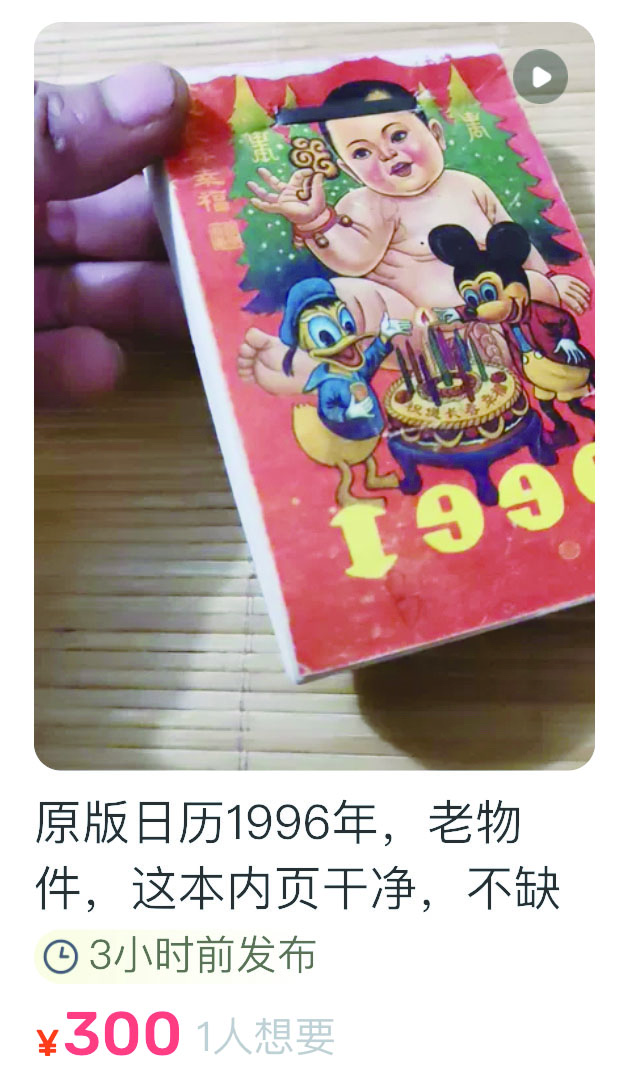 不少卖家接连上架好几波1996年的老物件,个别挂历日历收藏爱好者压箱底的“余货”都拿了出来,几乎卖空了,价格在30元到400元不等。