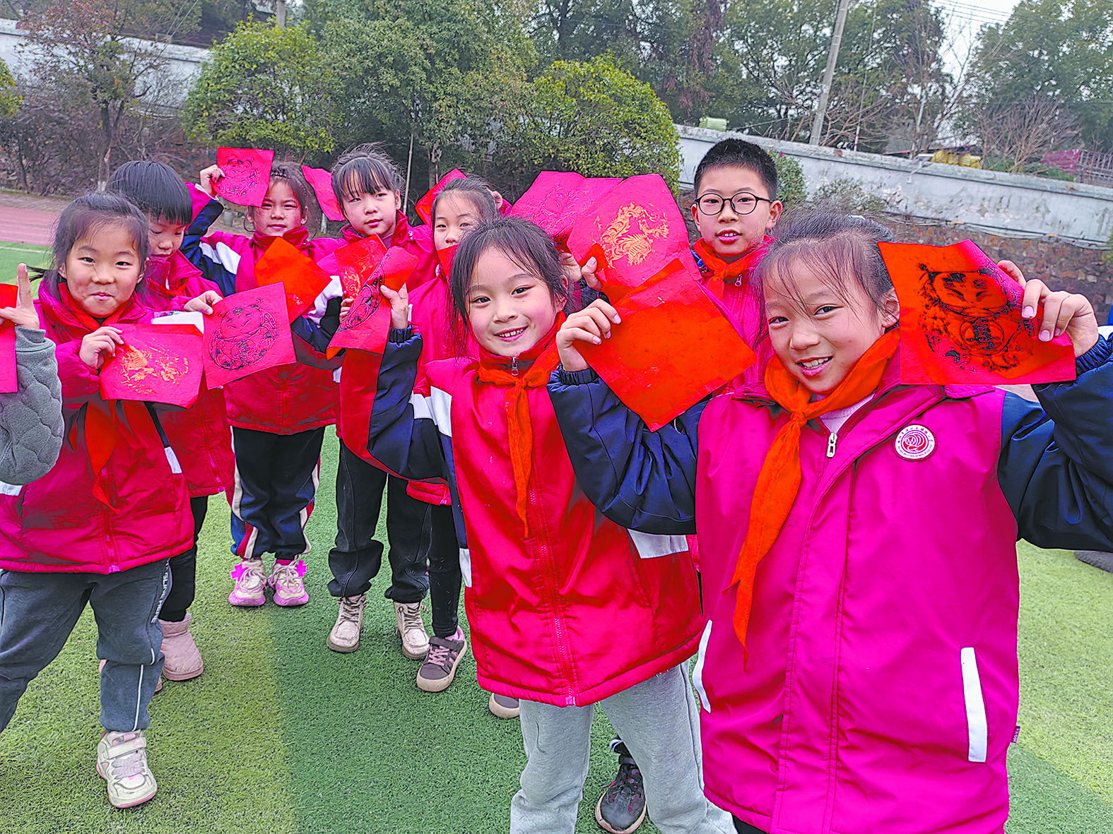 “瞧瞧我的作品!”明德小学校园记者展示自己的拓印年画作品。记者/刘文 摄