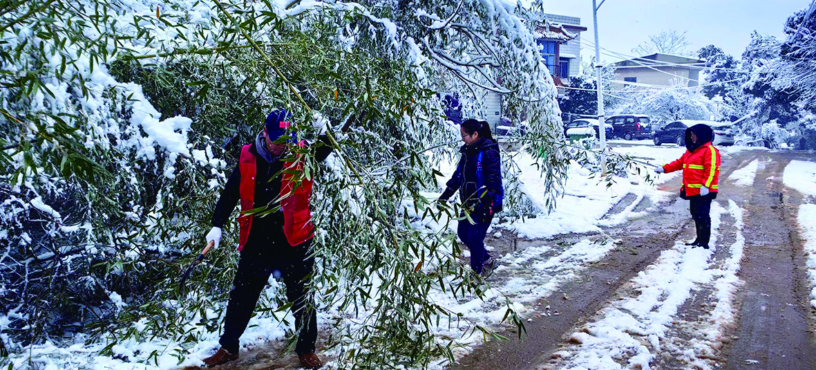 石峰区井龙街道郭家塘村网格员和村支两委成员清理村路上被雪压塌的树枝树干及断落网线。 通讯员供图
