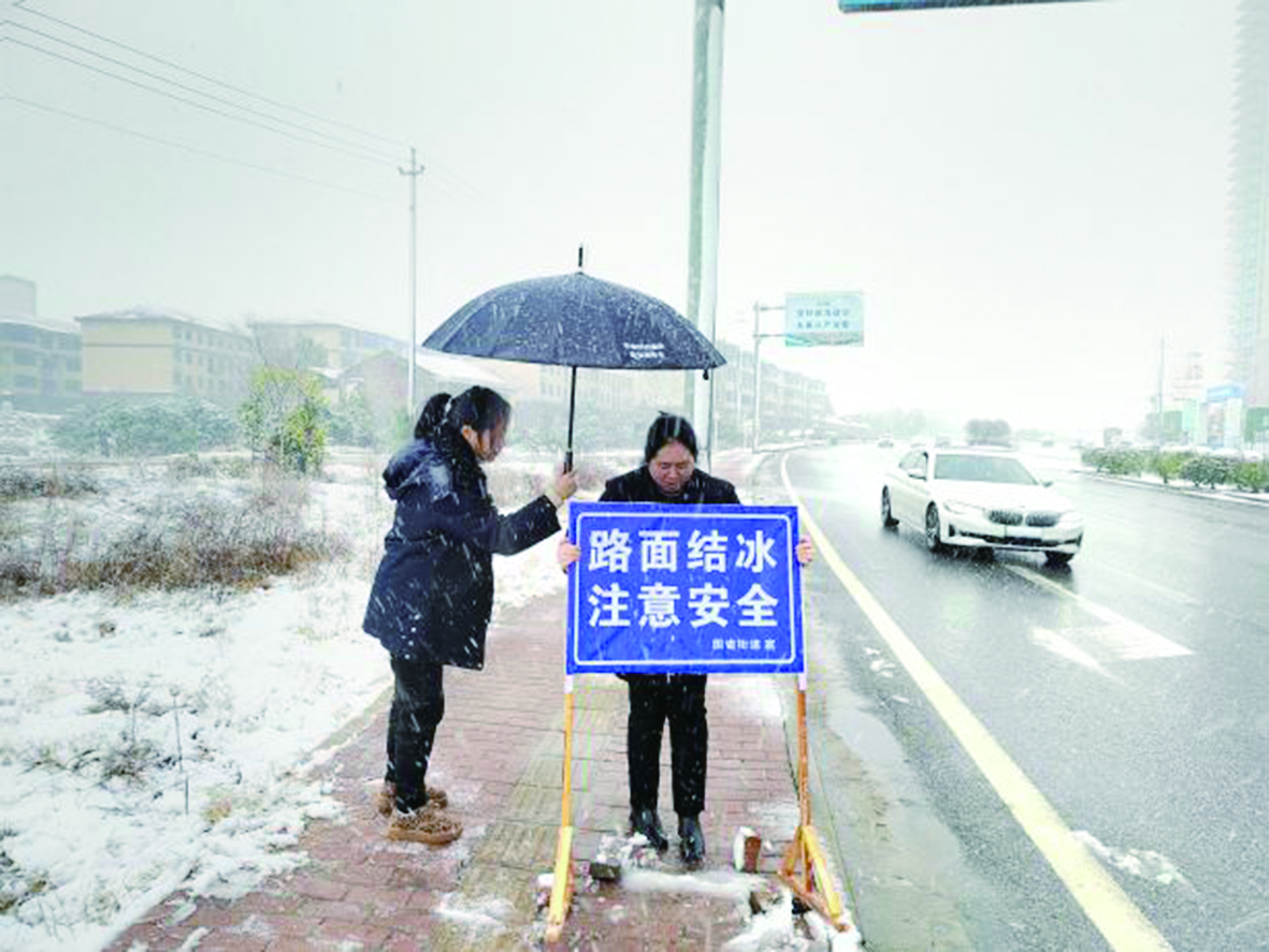 醴陵市网格员正在摆雨雪天气交通提示牌。 通讯员供图