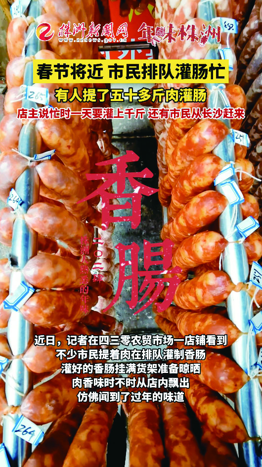 春节将近,市民排队灌肠忙。近日,在四三零农贸市场一店铺,不少市民提着肉在排队灌制香肠。有人提了五十多斤肉灌肠,店主说忙时一天要灌上千斤,还有市民从长沙赶过来。灌好的香肠挂满货架准备晾晒,肉香味时不时从店内飘出,仿佛闻到了过年的味道。