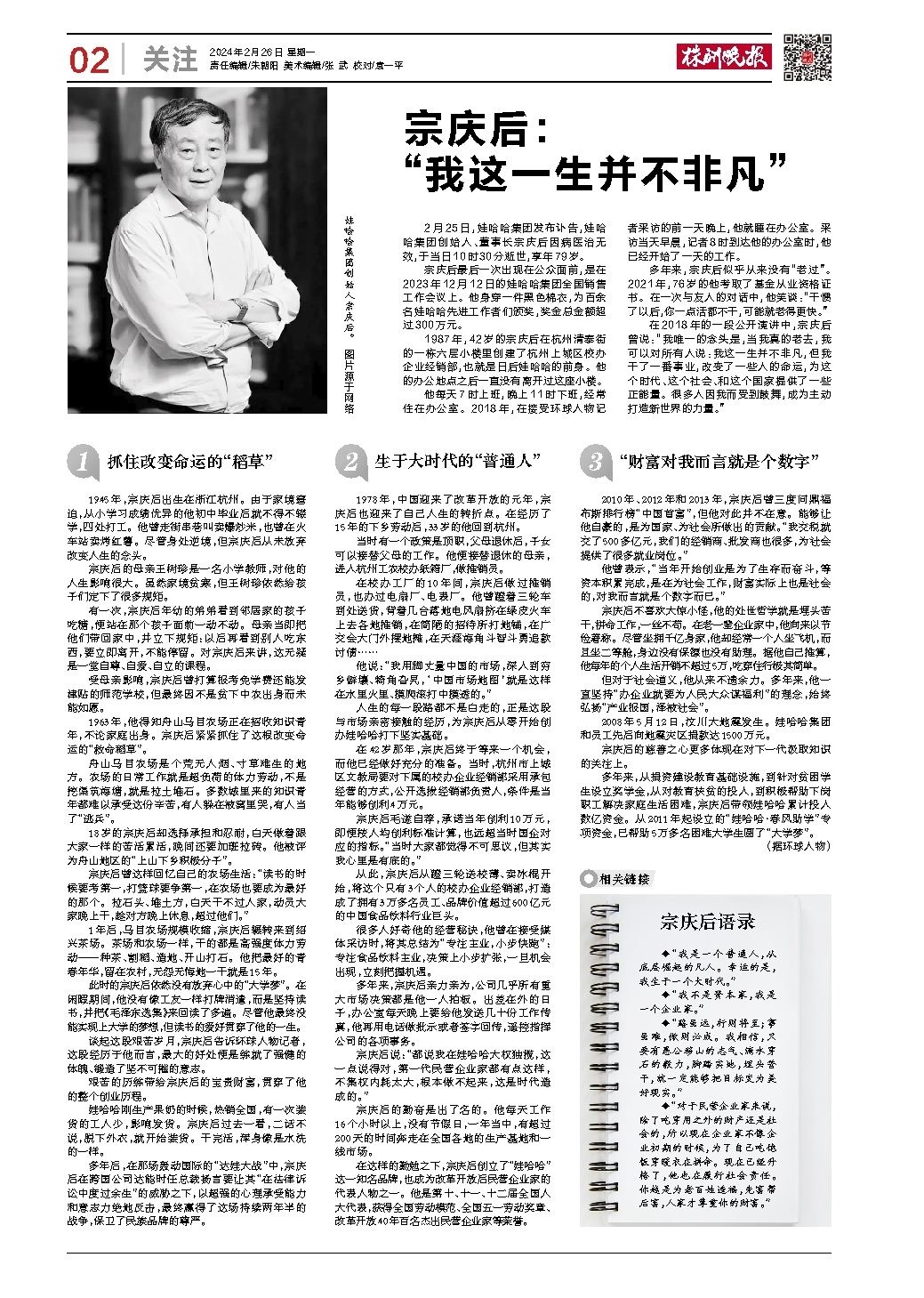 宗庆后: “我这一生并不非凡”