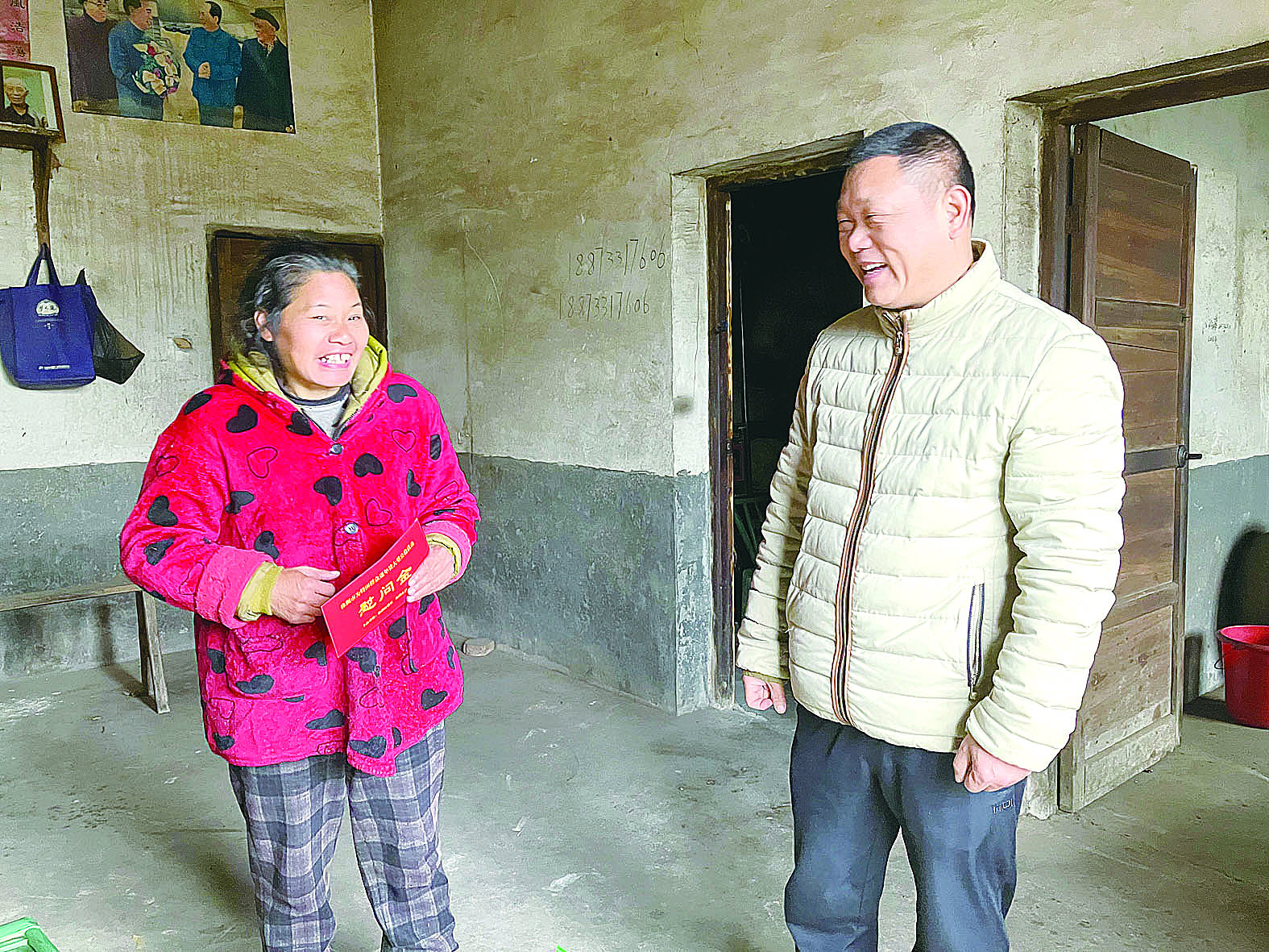 汤爱军(右)将慰问金送到困难群众手中并亲切交谈。 记者/姚时美 摄