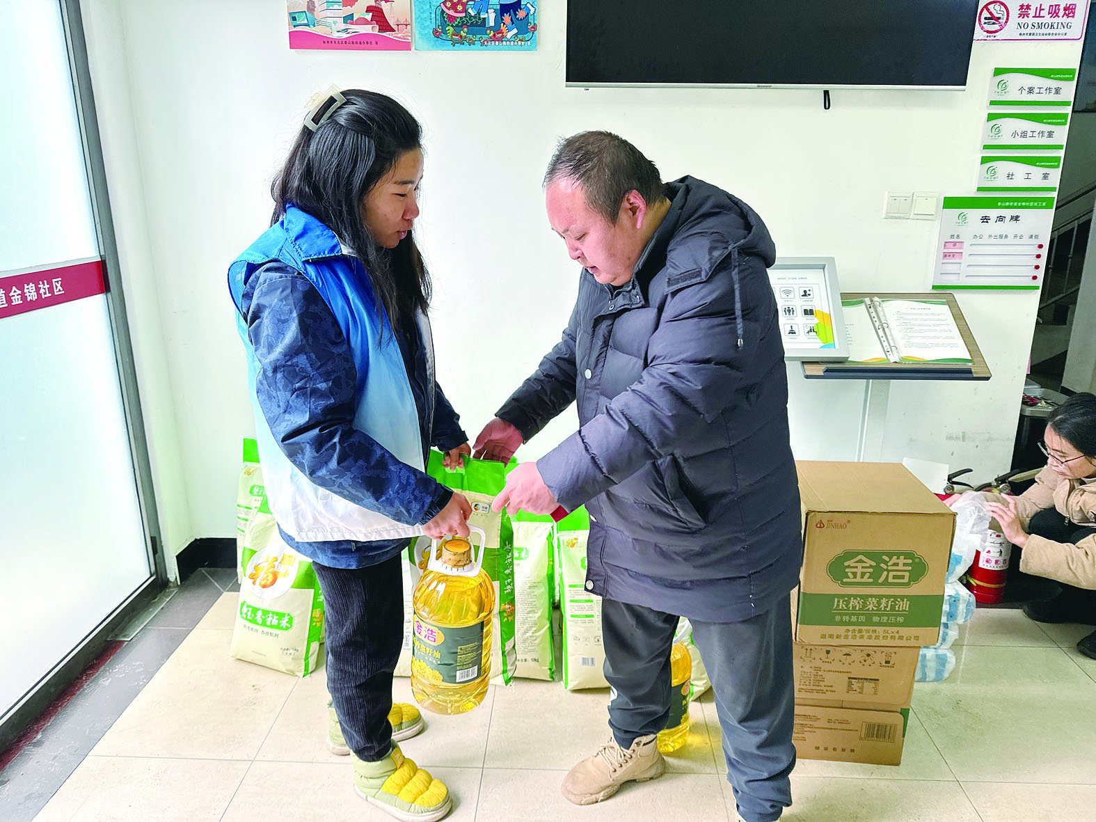 受助居民收到年货,十分开心。 记者/谢嘉 摄