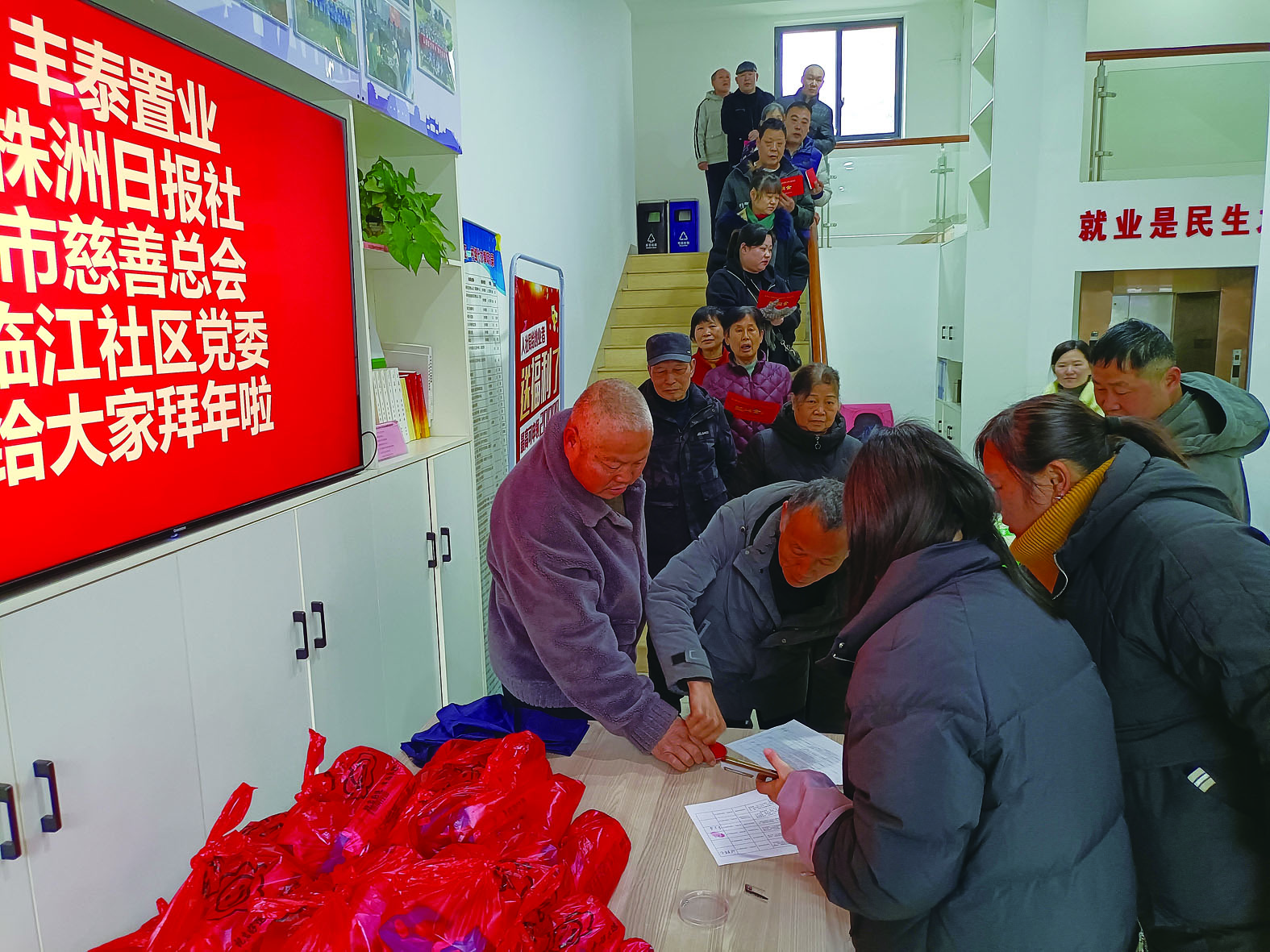 2月3日上午,天元区临江社区20户困难群众,领到了300元现金红包和米、油、面等过年物资,这些爱心年货由株洲丰泰置业有限公司送出。丰泰置业已经连续12年参与“送年货”公益活动,今年认捐2万元,已顺利为天元区40户特困群众送上爱心。