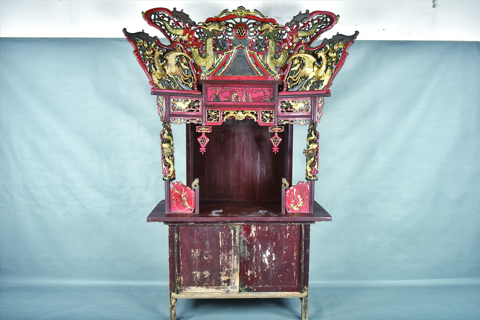 民国红漆鎏金雕刻人物龙凤纹长方形带柜四足座木神龛。通讯员供图