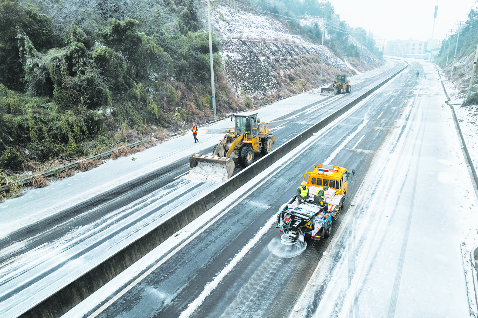 2月5日,桃江县公路局工作人员对辖区道路撒盐除冰(无人机照片)。