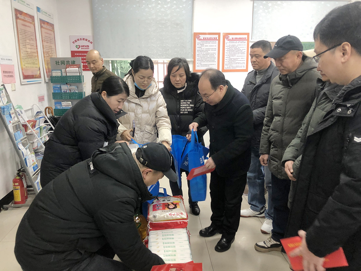 代表陈二喜(居中)等为特困群众发放年货物资及慰问金。 记者/郑炜青 摄