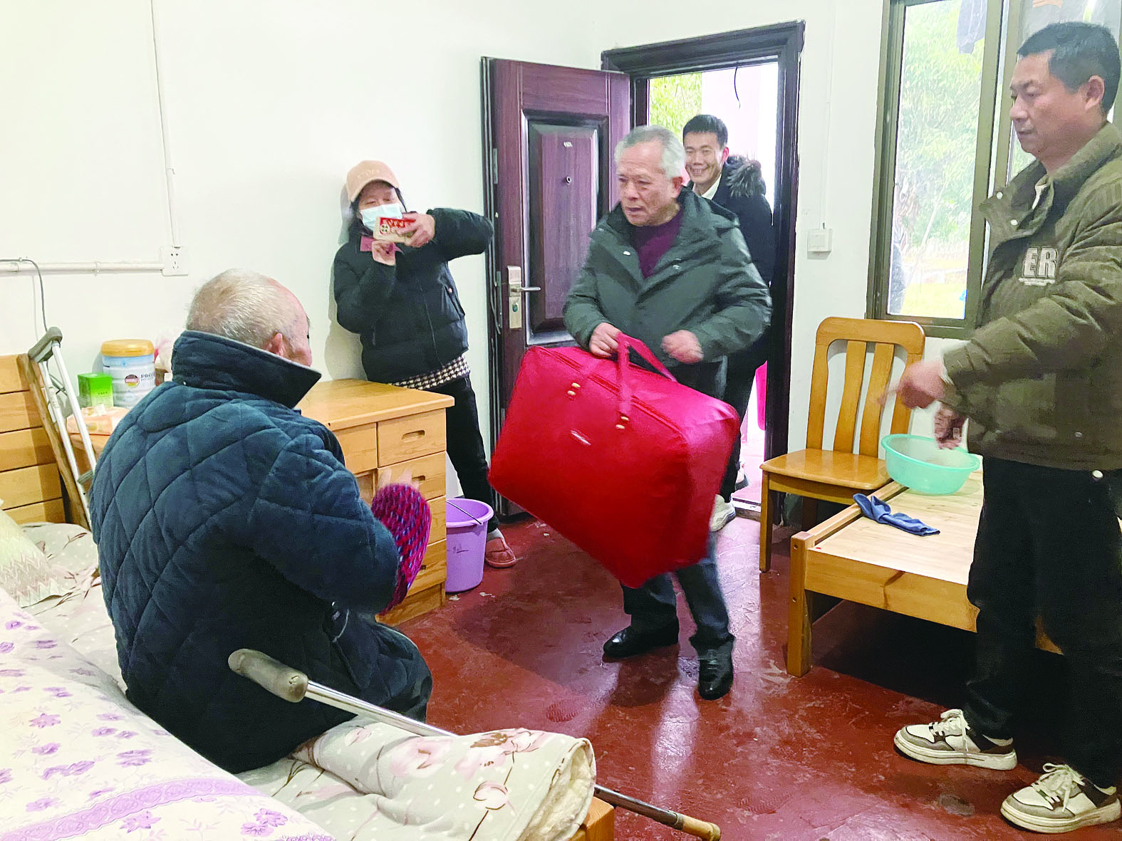 张长高(中)将一床厚棉被送给老人。记者/姚时美 摄