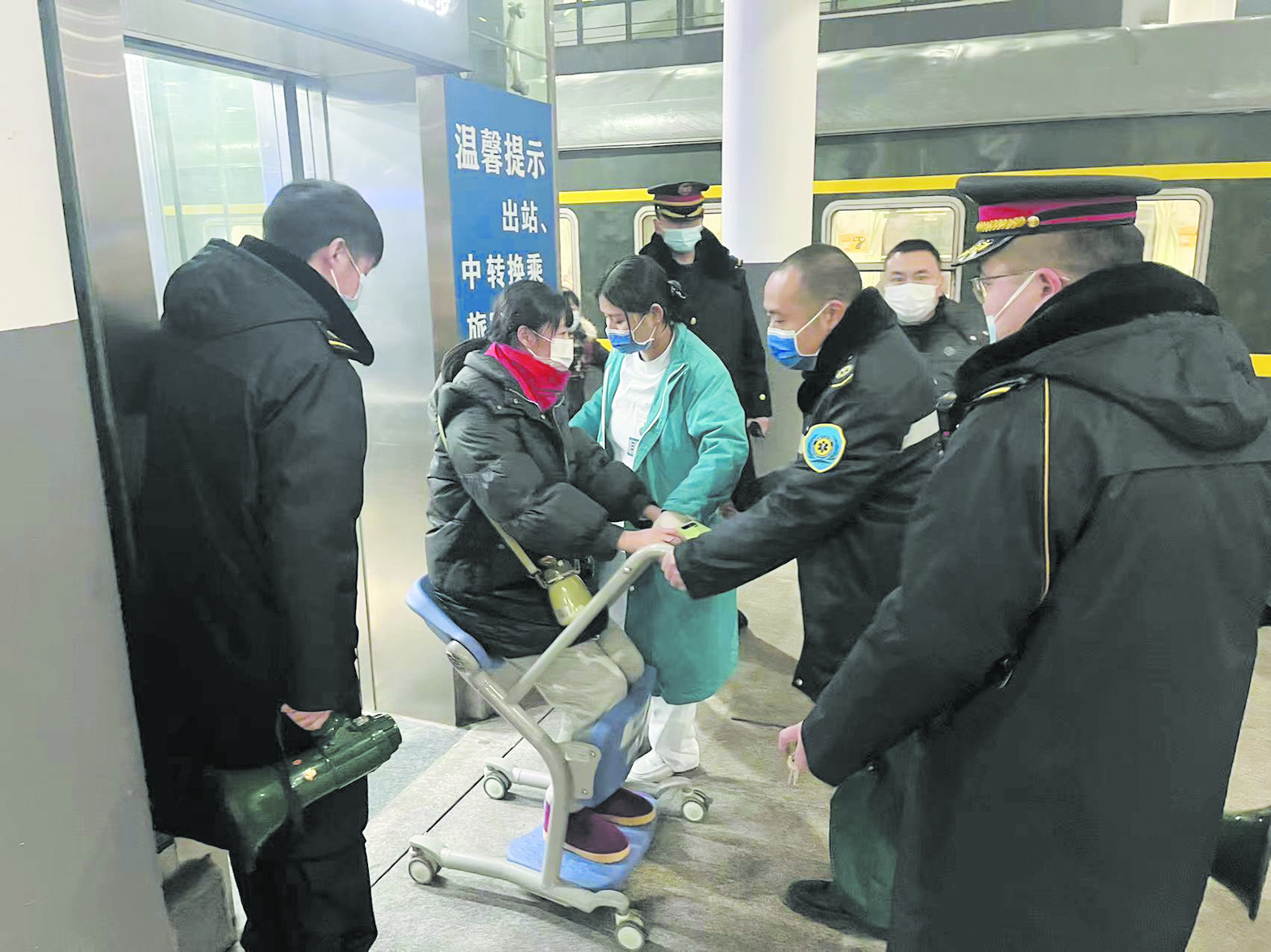 ◀在火车站工作人员的帮助下,仅用5分钟,就将急需就医的孕妇送上救护车。 通讯员/张娟 供图