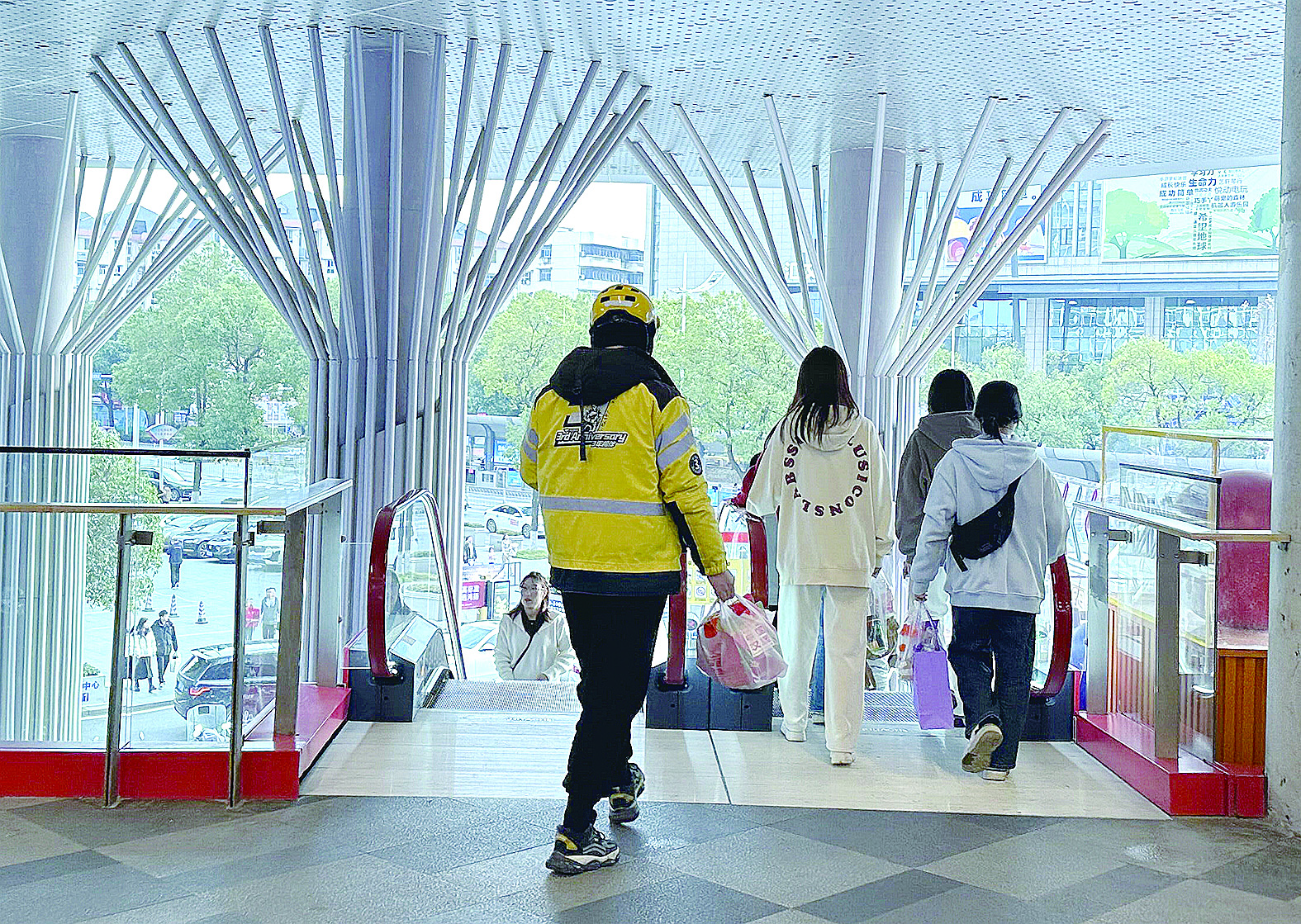 小陈一边查看送餐信息,一边快速走出商场。记者/戴凛 摄