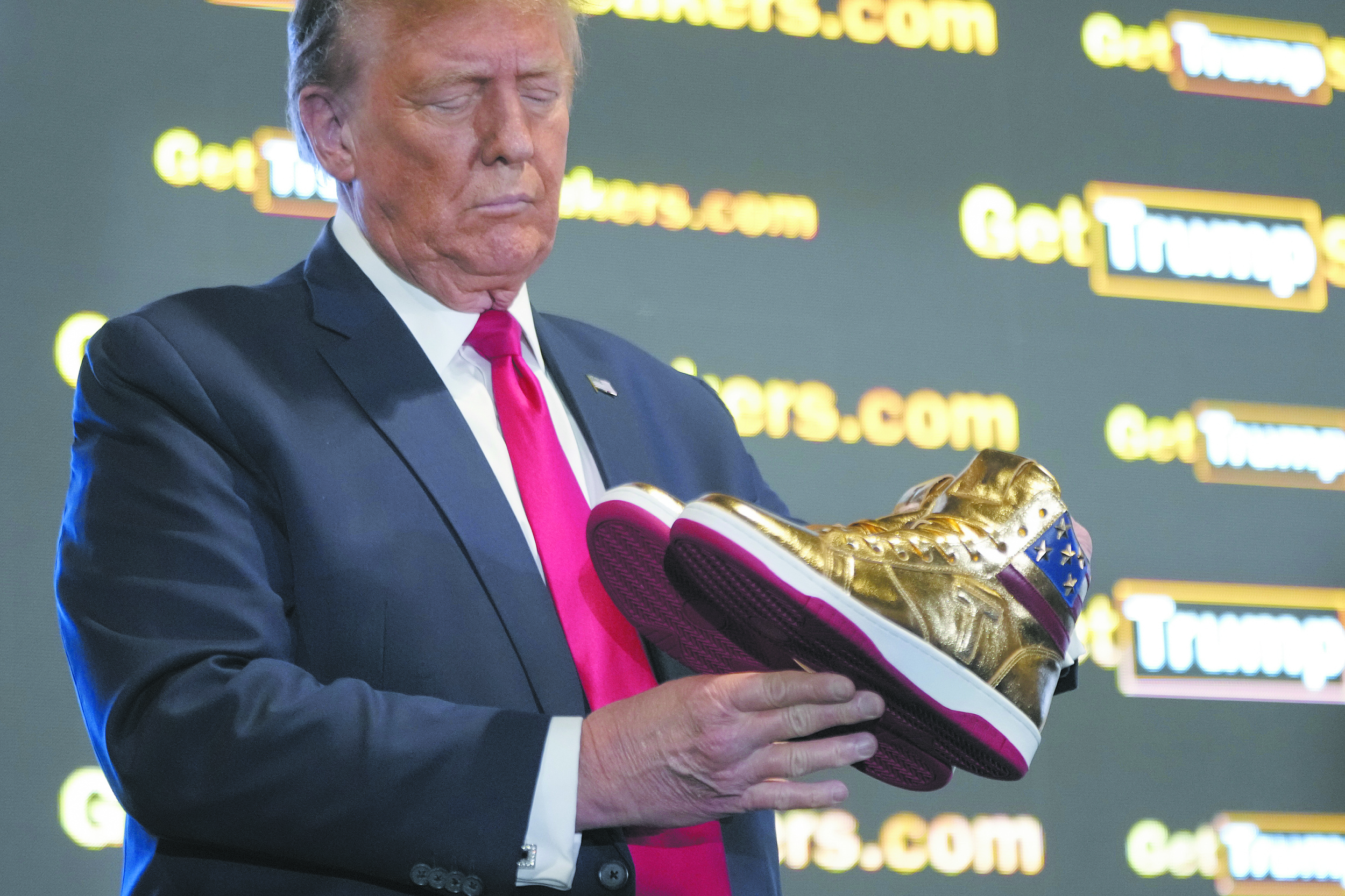2月17日,美国前总统特朗普在一场商业活动中带货了一双“特朗普”牌的金色高帮运动鞋。当天,他在费城会议中心举行的运动鞋展会上发表演讲,并在讲台上手持一双金色的“特朗普”牌运动鞋进行展示,特朗普将其命名为“永不投降高帮运动鞋”。据介绍,这双运动鞋售价为399美元,鞋身为金色,背面有美国国旗的细节。
