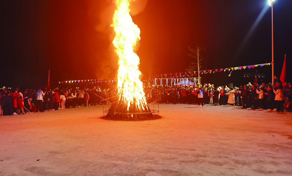 这是胜塘村举办的首届新春篝火晚会,当晚7点烟花燃放后,音乐、舞蹈轮番上阵。熊熊燃烧的篝火,预示着大家在新的一年里日子红红火火。