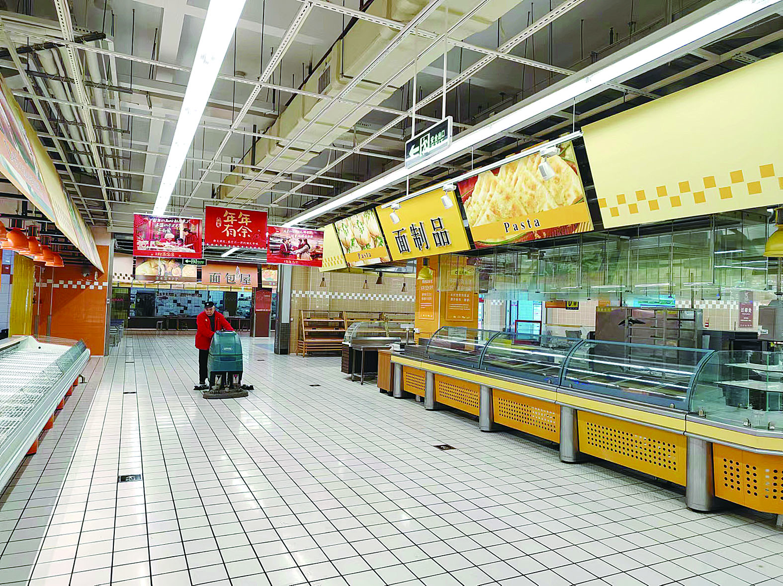 店内部分卖场已撤柜,一位保洁员在清扫地面。图片均为记者/沈勇跃 摄