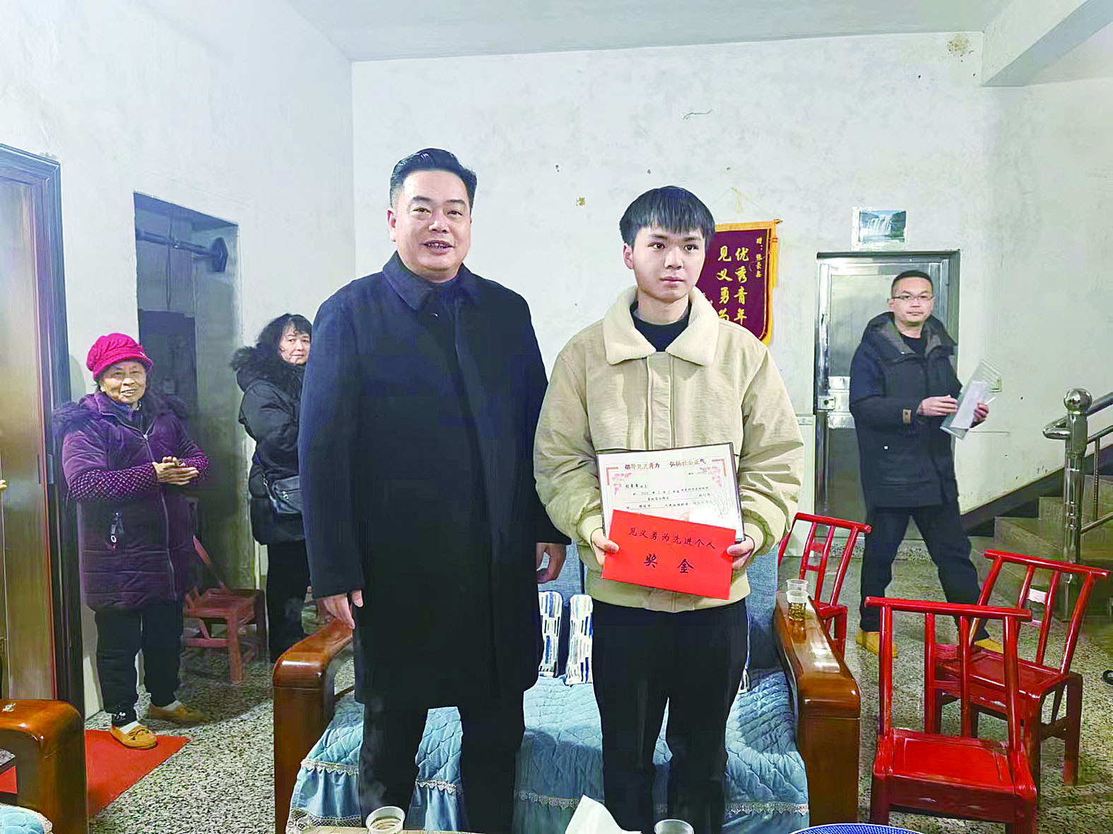 2月21日下午,醴陵市委政法委和武装部领导前往板杉镇寨下村,为张豪鑫送上见义勇为确认证书,表彰他传递正能量,为平安株洲建设作出积极贡献。