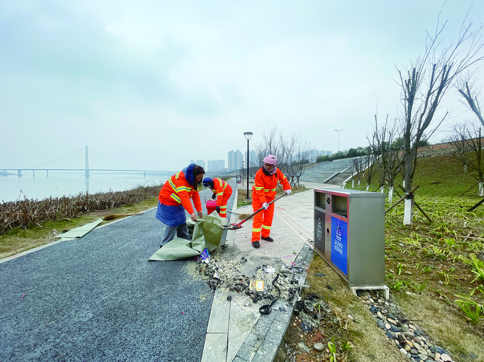 工作服里套了厚实的羽绒服,一次次弯腰捡拾、装袋,罗佩芬的背上已经开始冒汗。被江边的冷风一吹,她忍不住打了个哆嗦。“今年还算天公作美,没有什么雨雪,不然这些纸屑都黏在地上,我们清理起来更困难。”罗佩芬笑言。