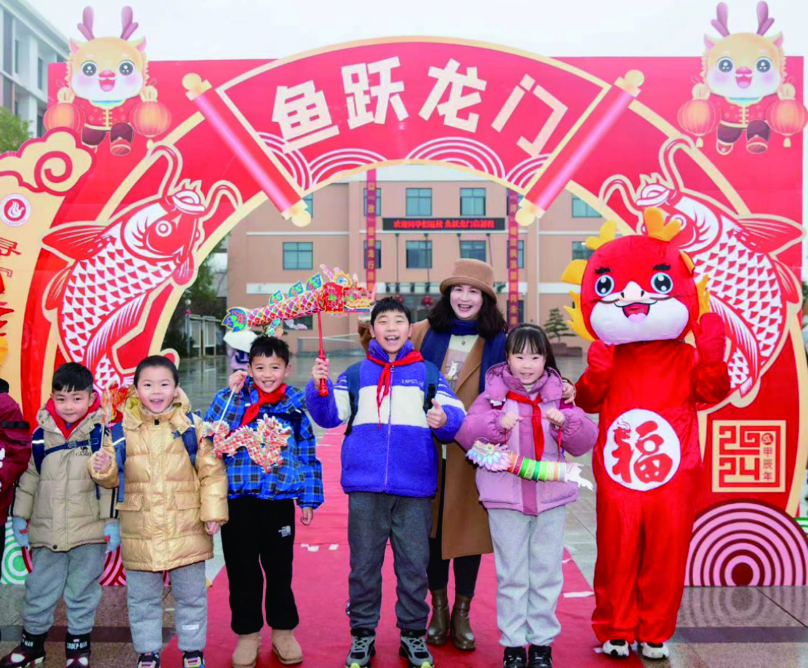 ▶学生们拿着龙灯、龙形头饰、福字、对联等携带着龙元素的手工制品进入校园。