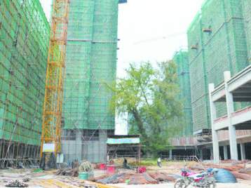 2013年7月,古银杏树周围在施工建设,古树被在建的建筑“包围”。记者/刘平 摄