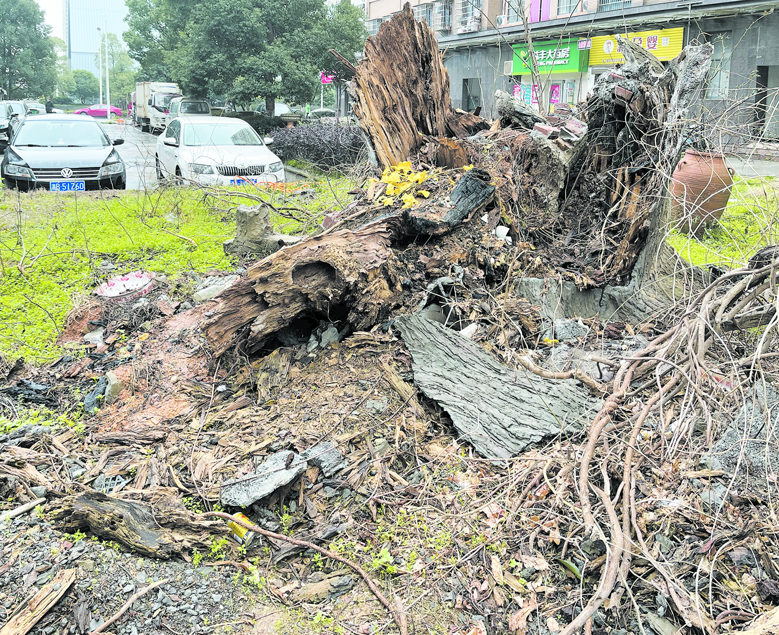 本报讯(株洲晚报融媒体记者/刘平) 近日,有市民在石峰区城发时代新城小区,发现当地一棵古银杏树已变成一堆烂木头。