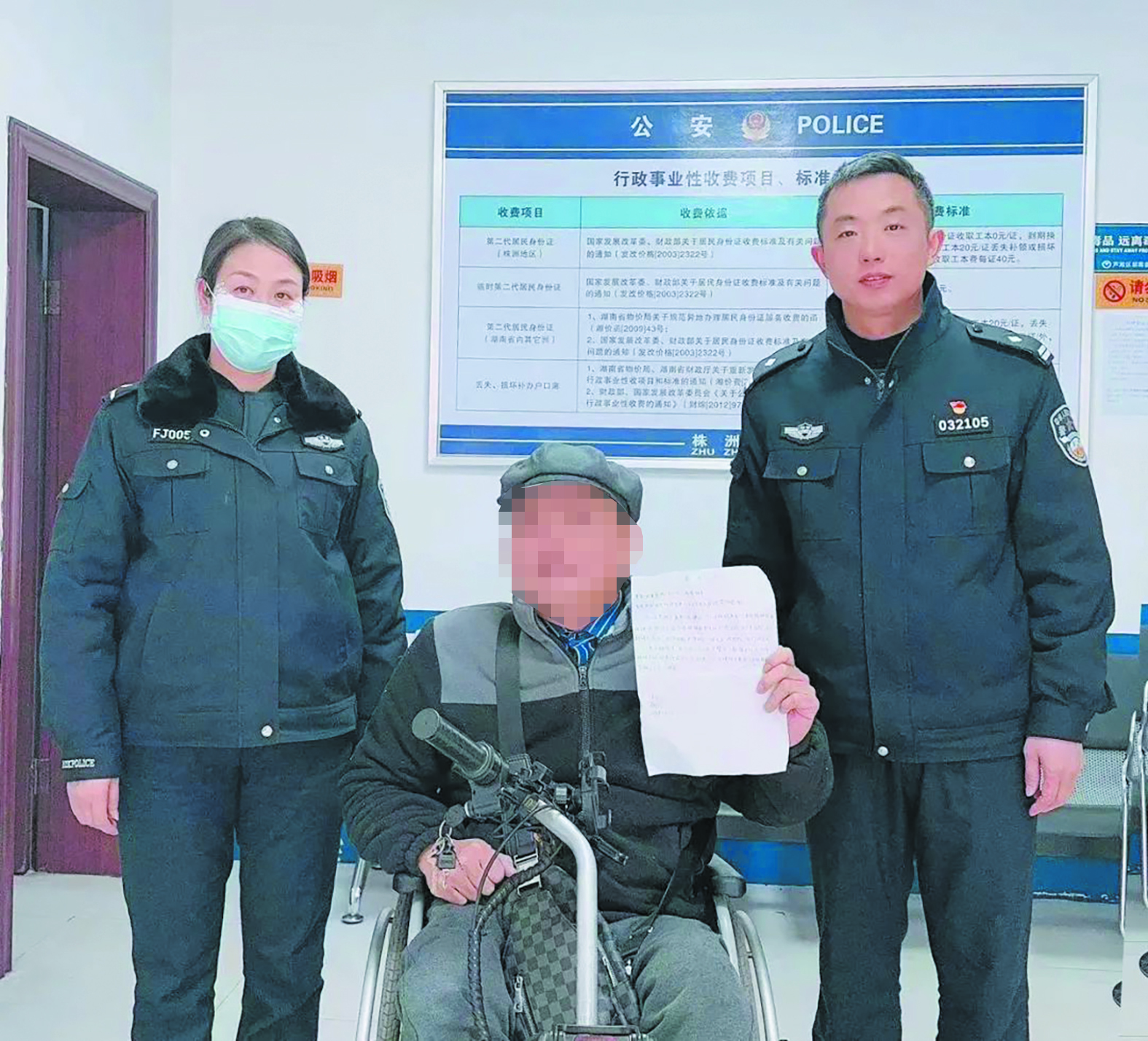 原来,辖区居民邱某身份证有效期满,却因精神残疾加上卧病在床行动不便无法到派出所补办。社区民辅警了解情况后,第一时间赶到医院为其办理身份证,遂有文头一幕。