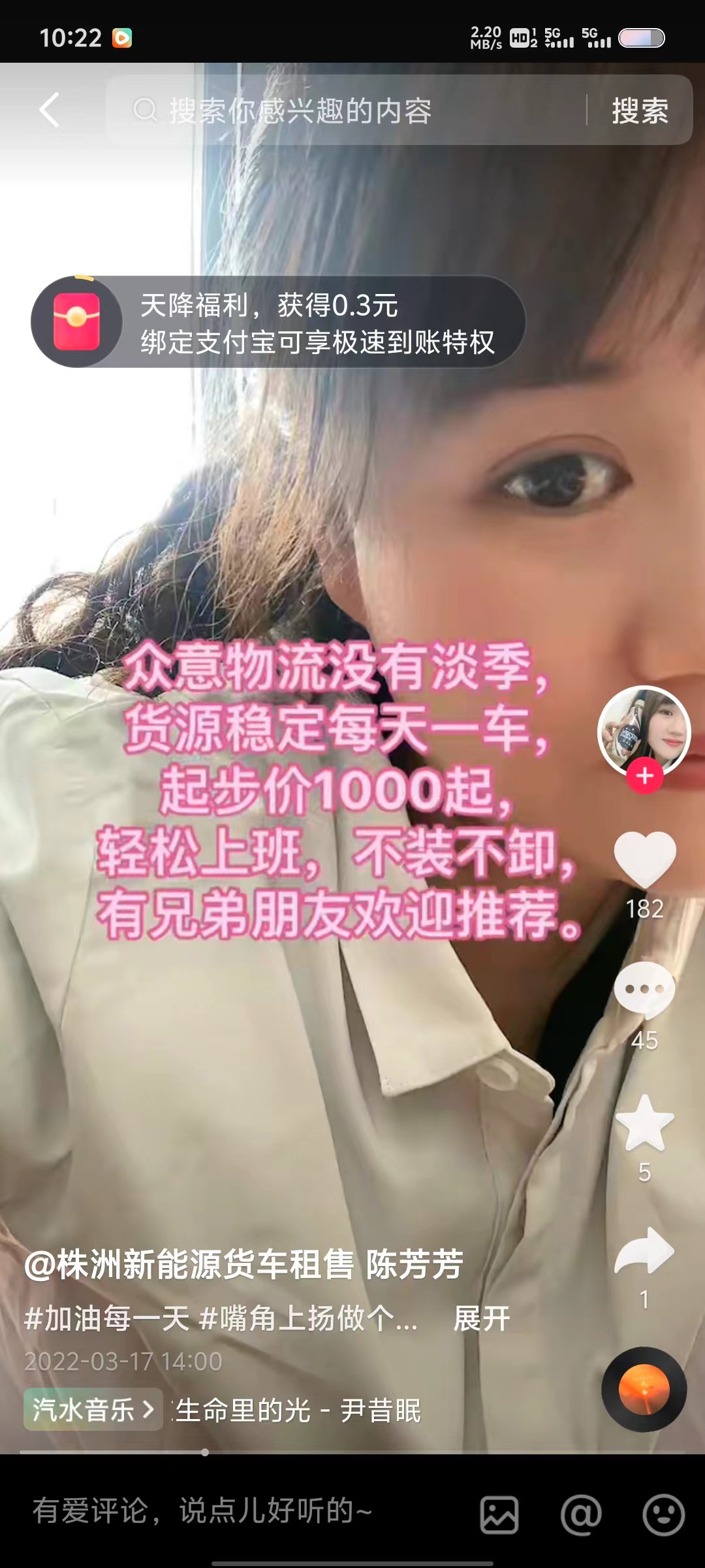 3月17日,抖音平台名为“株洲新能源货车租售·陈芳芳”的账号仍在发布众意公司广告。 抖音截图