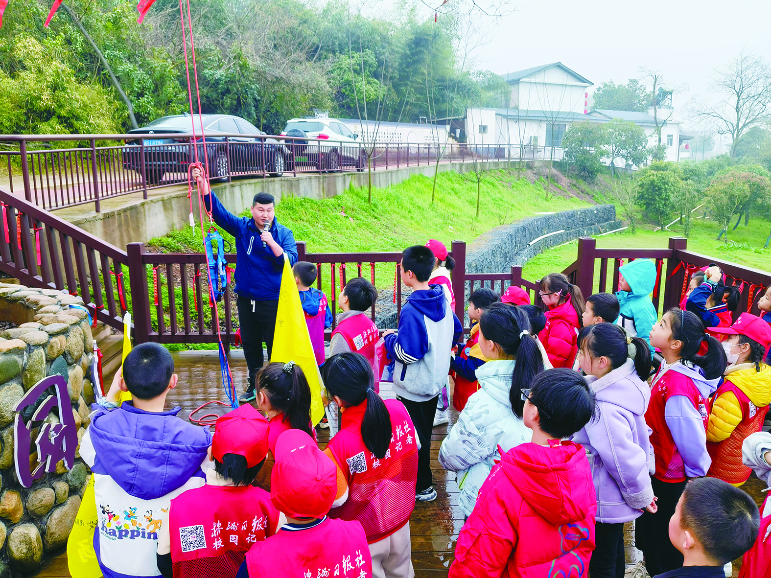 老师为校园记者讲解绳索攀树技巧。通讯员/供图