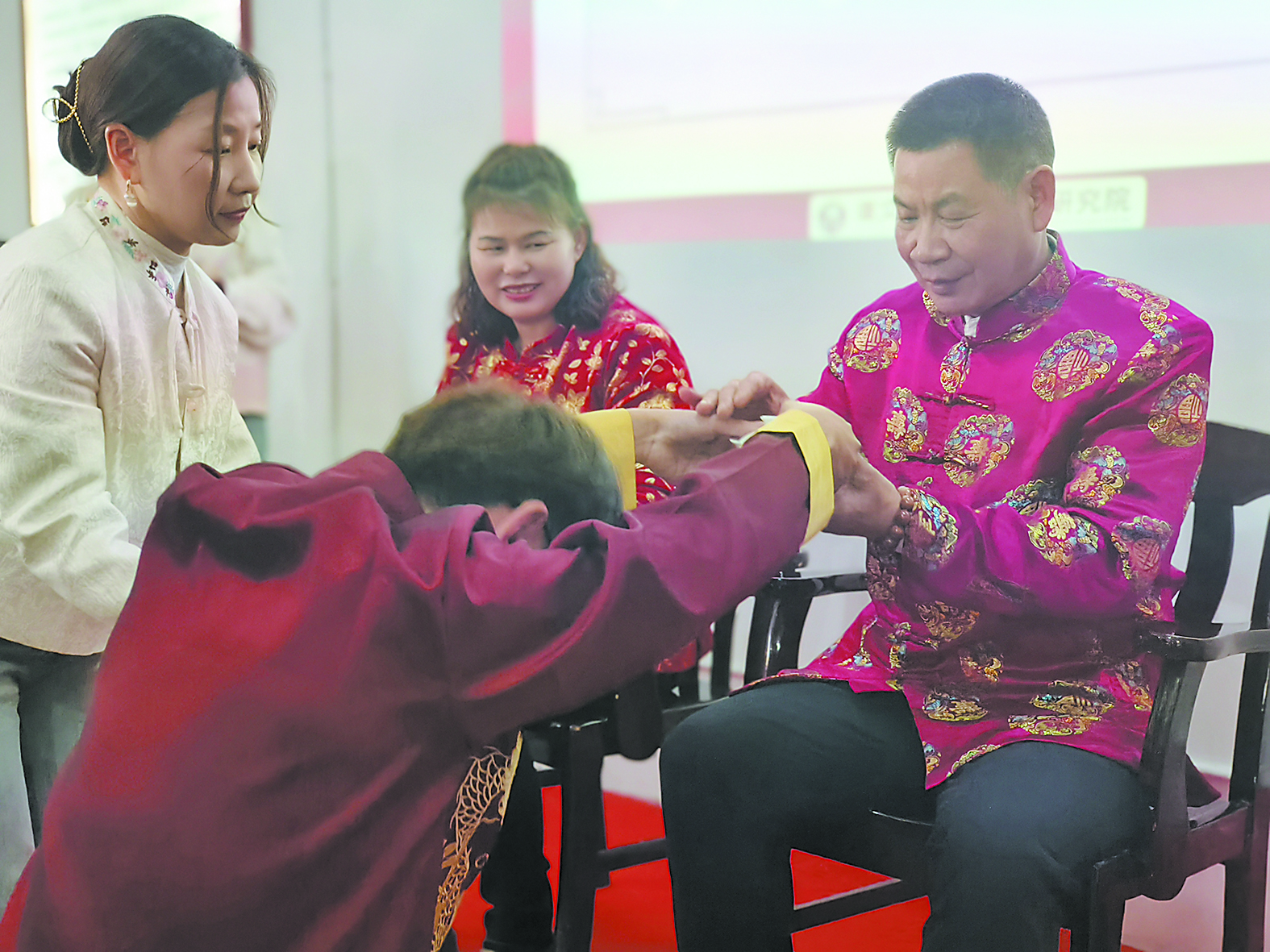 “湖南好人”谭文剑端起新弟子敬的茶。记者/廖智勇 摄