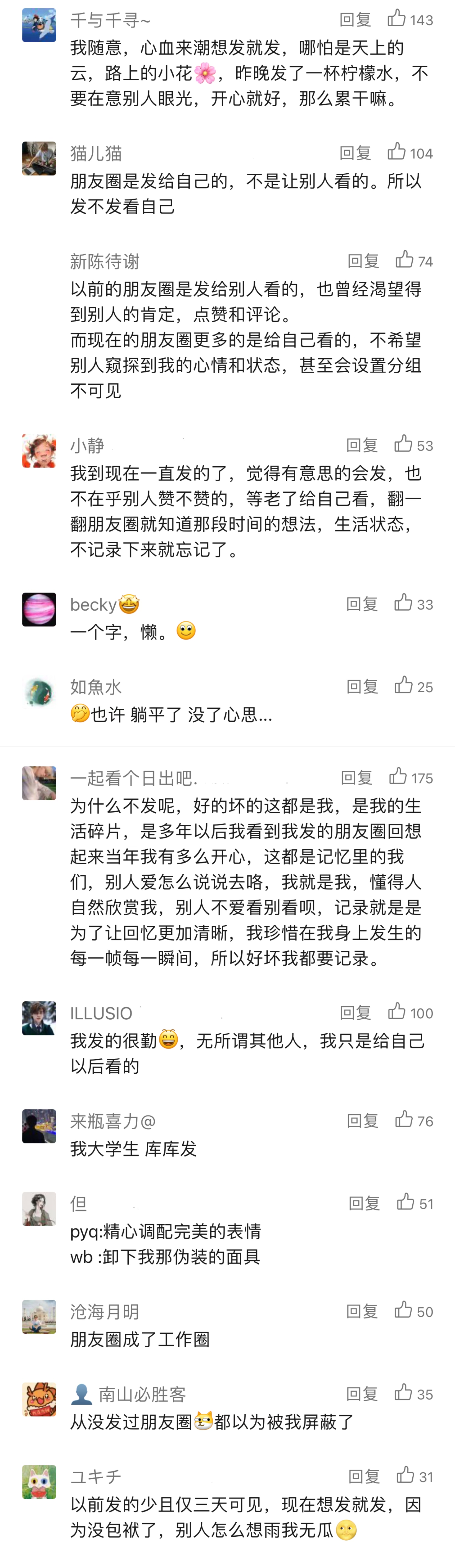 当然,也有很多人依然坚持在朋友圈分享。他们能更加成熟地处理着人际关系,也找到了属于自己的分享方式。