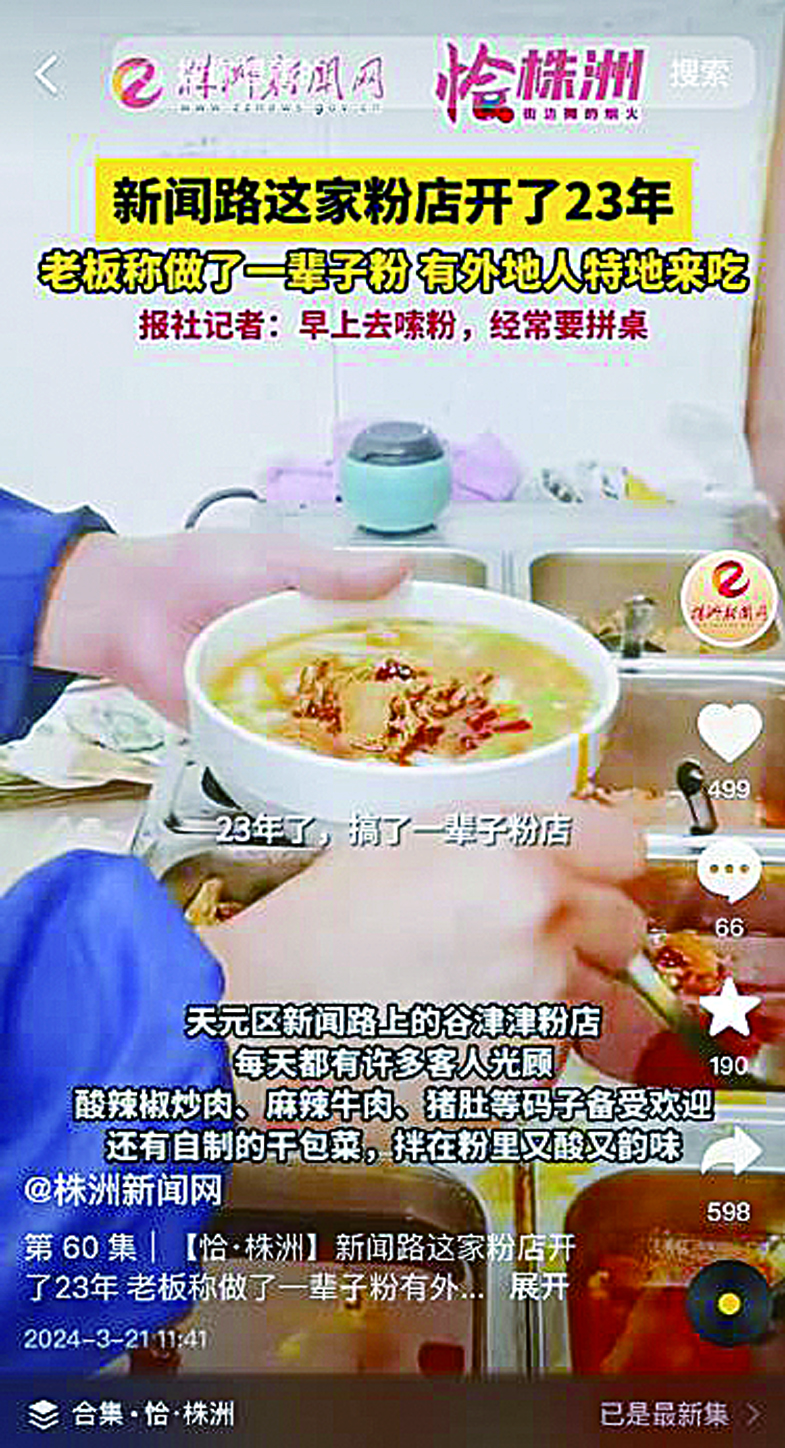 天元区新闻路上的谷津津粉店开了23年,算得上报社人早餐食堂,早上去嗦一口常常需要拼桌。酸辣椒炒肉、麻辣牛肉、猪肚等码子备受欢迎,自制干包菜拌在粉里又酸又韵味!