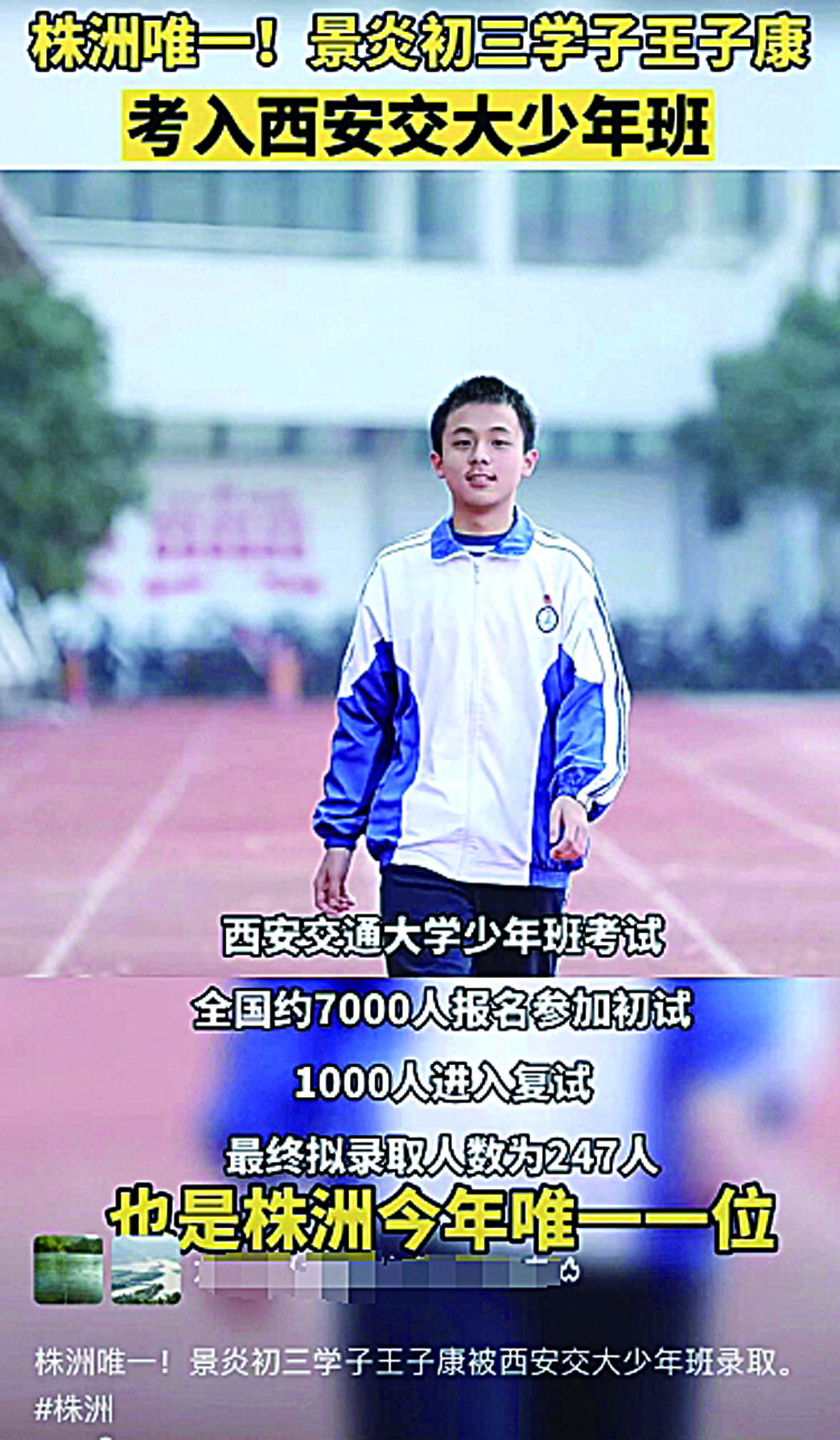 上周,2024年西安交大少年班录取结果出炉,景炎初级中学初三王子康同学被西安交大少年班正式录取。这是今年株洲市的唯一一位,他也成为该校第36位被西安交大少年班录取的学生。