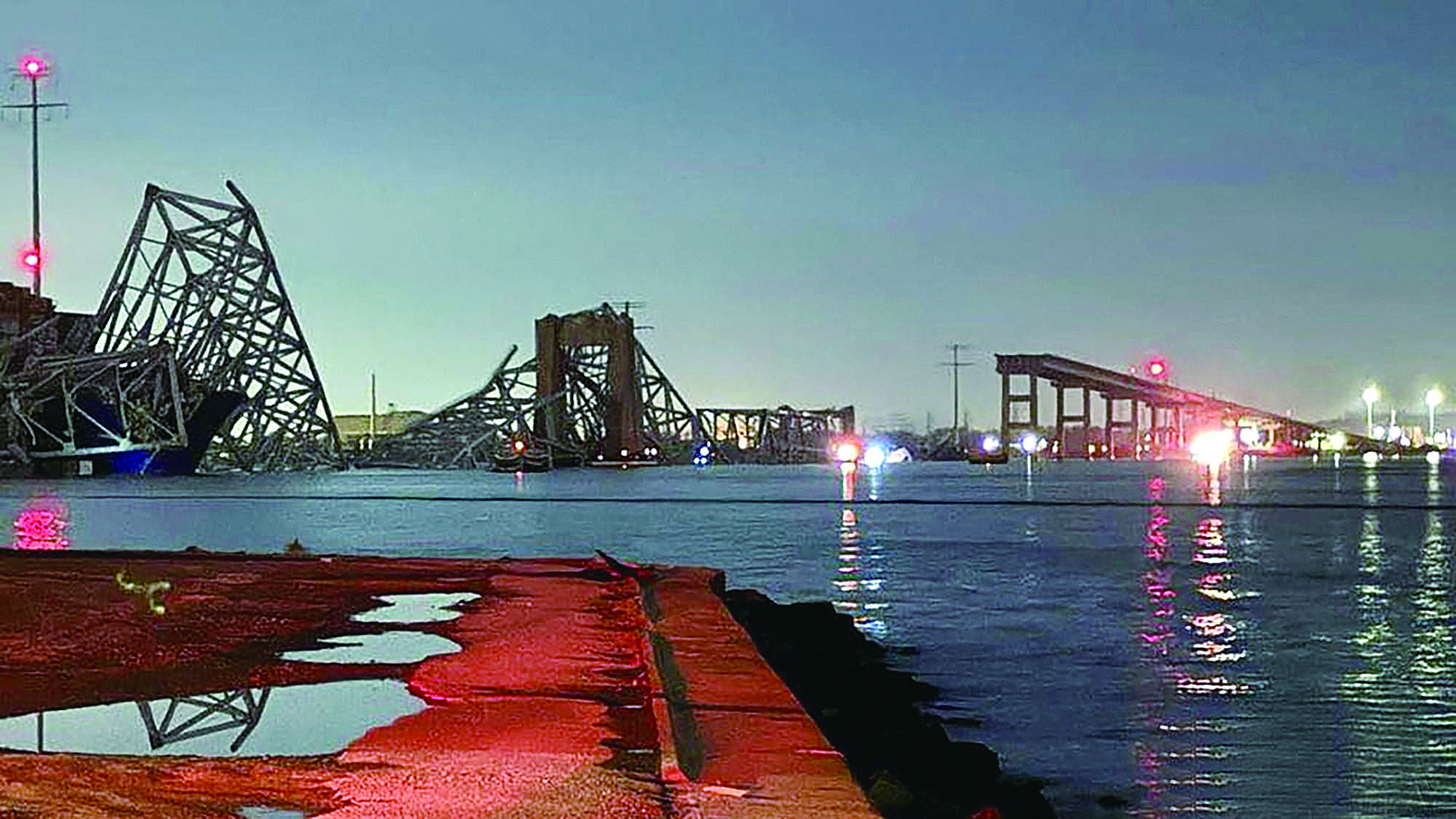 当地时间3月26日凌晨,美国马里兰州巴尔的摩市一座大桥被巨型货船撞断,多辆汽车坠入河中,据说已经有20人落水,救援队正在搜索中,有可能造成较大伤亡,绝对是一场灾难性的事件。图为事故现场。 (据今日新闻)